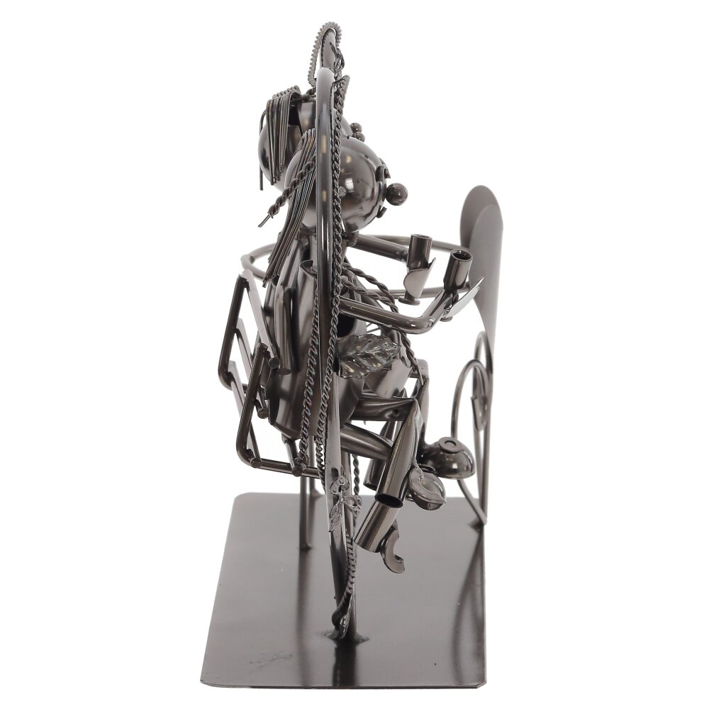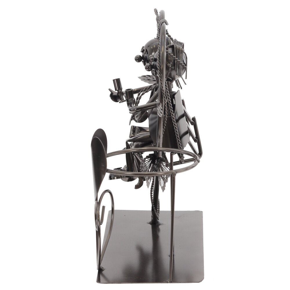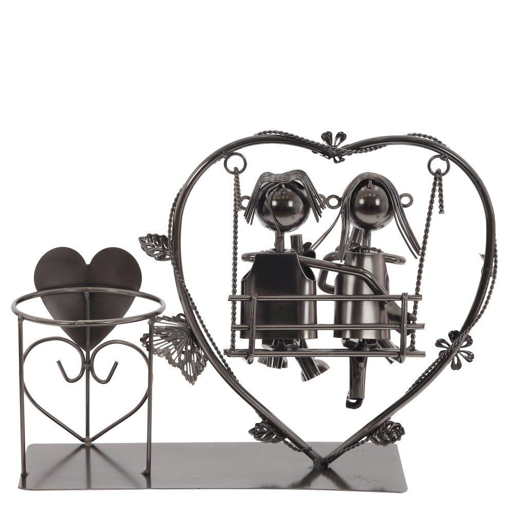Оригинальная металлическая подставка для бутылки в виде романтичной композиции. На прочном основании размещён держатель для одной бутылки вина, оформленный сердцем, а рядом – фигурки пары, сидящей на качелях внутри большого сердечного контура. Детально проработанные элементы, листья и цветы создают уютное, трогательное настроение. Подставка выполнена из качественного металла с устойчивым покрытием, хорошо смотрится в интерьере кухни, гостиной или бара. Идеально подходит для сервировки стола, оформления праздничного вечера, подарка на свадьбу, годовщину или День святого Валентина. Такая подставка не только удобно фиксирует бутылку, но и служит стильным декоративным акцентом, подчеркивая атмосферу любви и домашнего тепла.