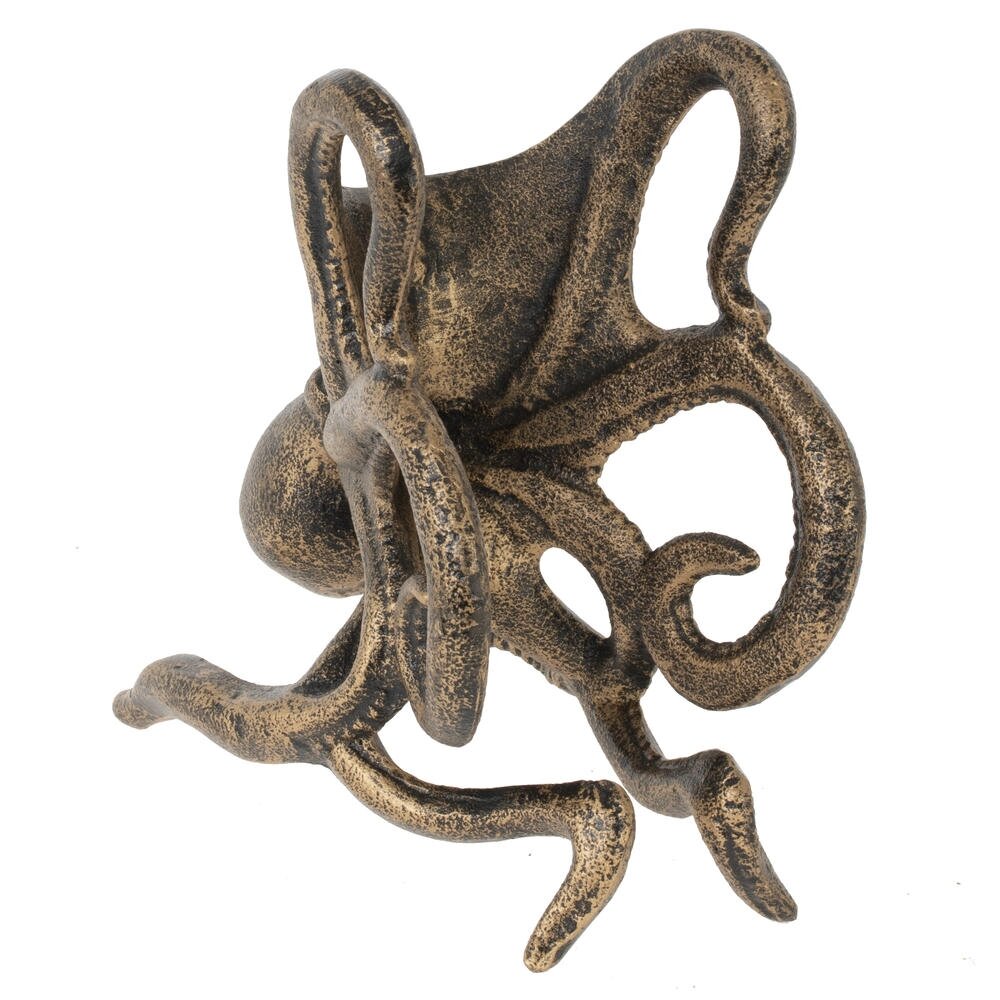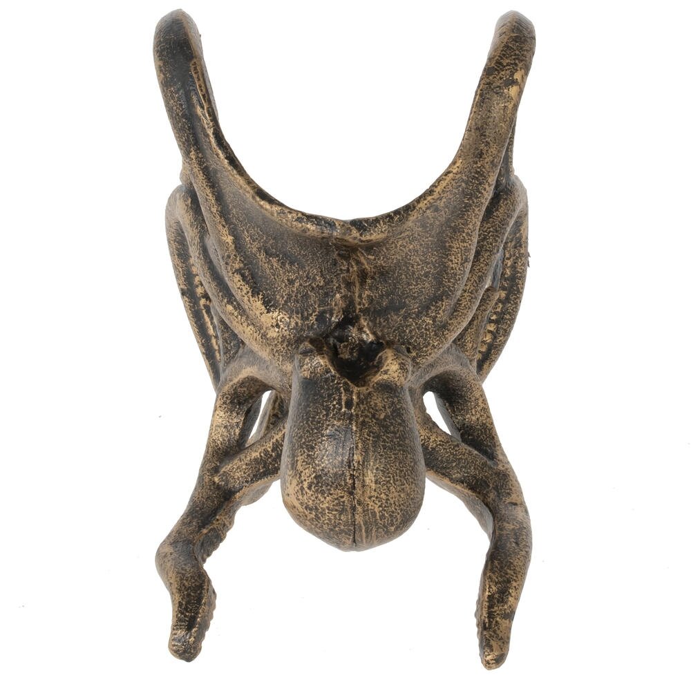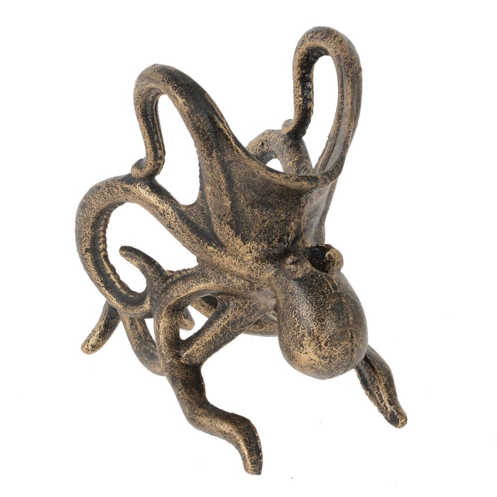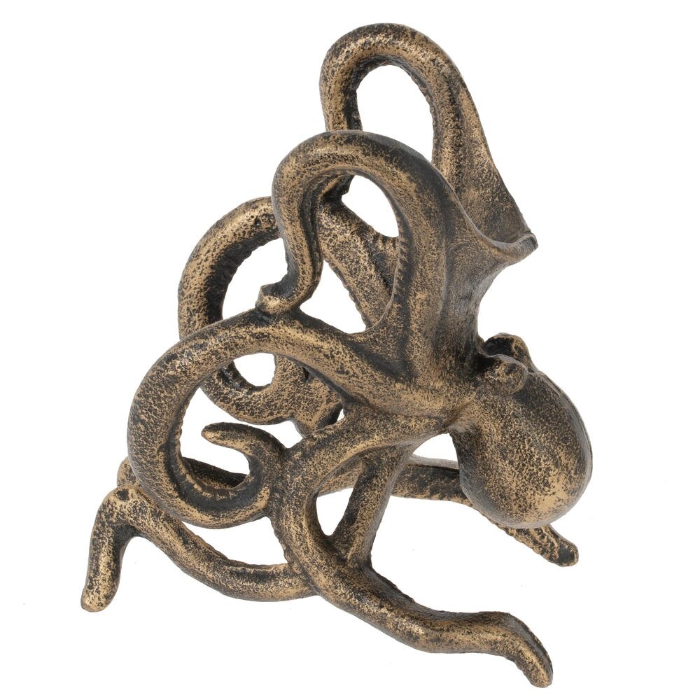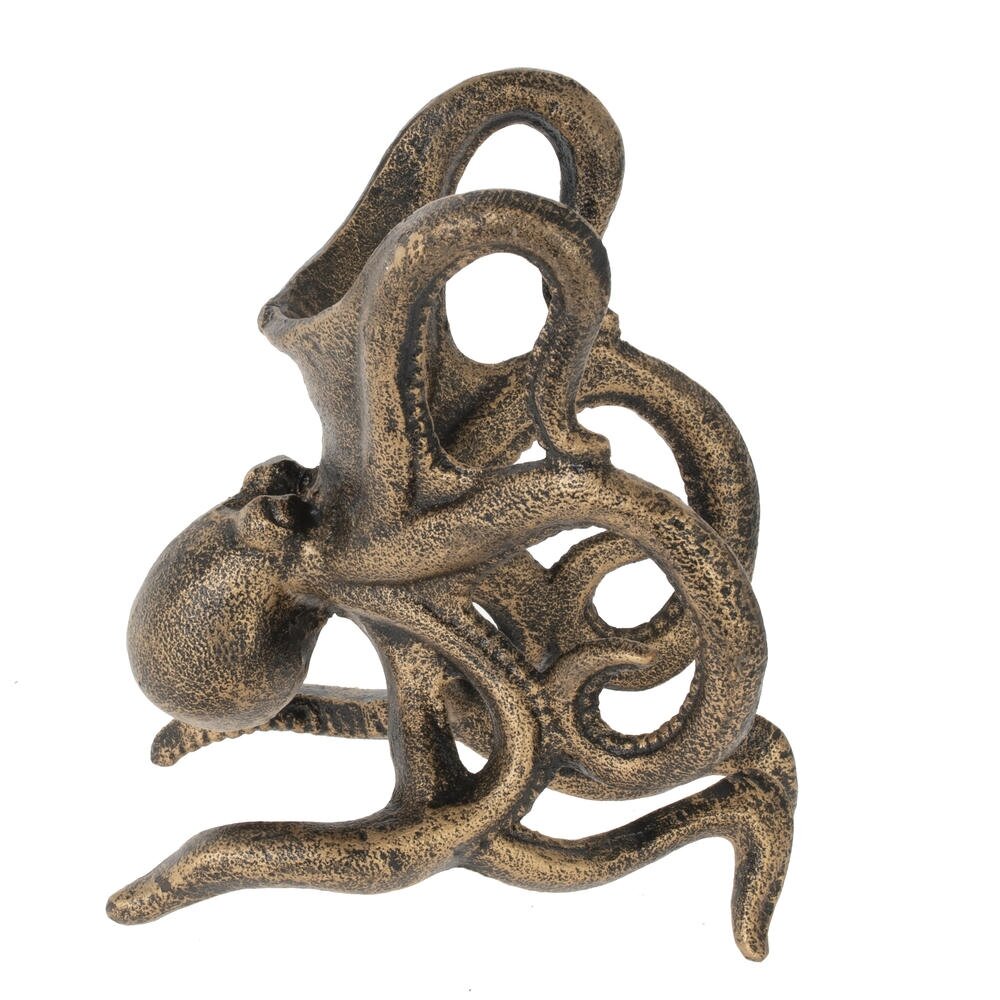 Эффектная подставка для бутылки «Осьминог» станет ярким акцентом вашего стола или домашнего бара. Фигура морского обитателя выполнена из прочного металла с благородным покрытием под старую бронзу, что придаёт изделию винтажный, слегка антикварный вид. Изогнутые щупальца надёжно фиксируют бутылку вина или другого напитка, обеспечивая устойчивость и защищая её от случайного опрокидывания. Подставка гармонично вписывается в интерьер в морском, винтажном или лофт?стиле и станет оригинальным подарком ценителям нестандартного декора и красивой сервировки.