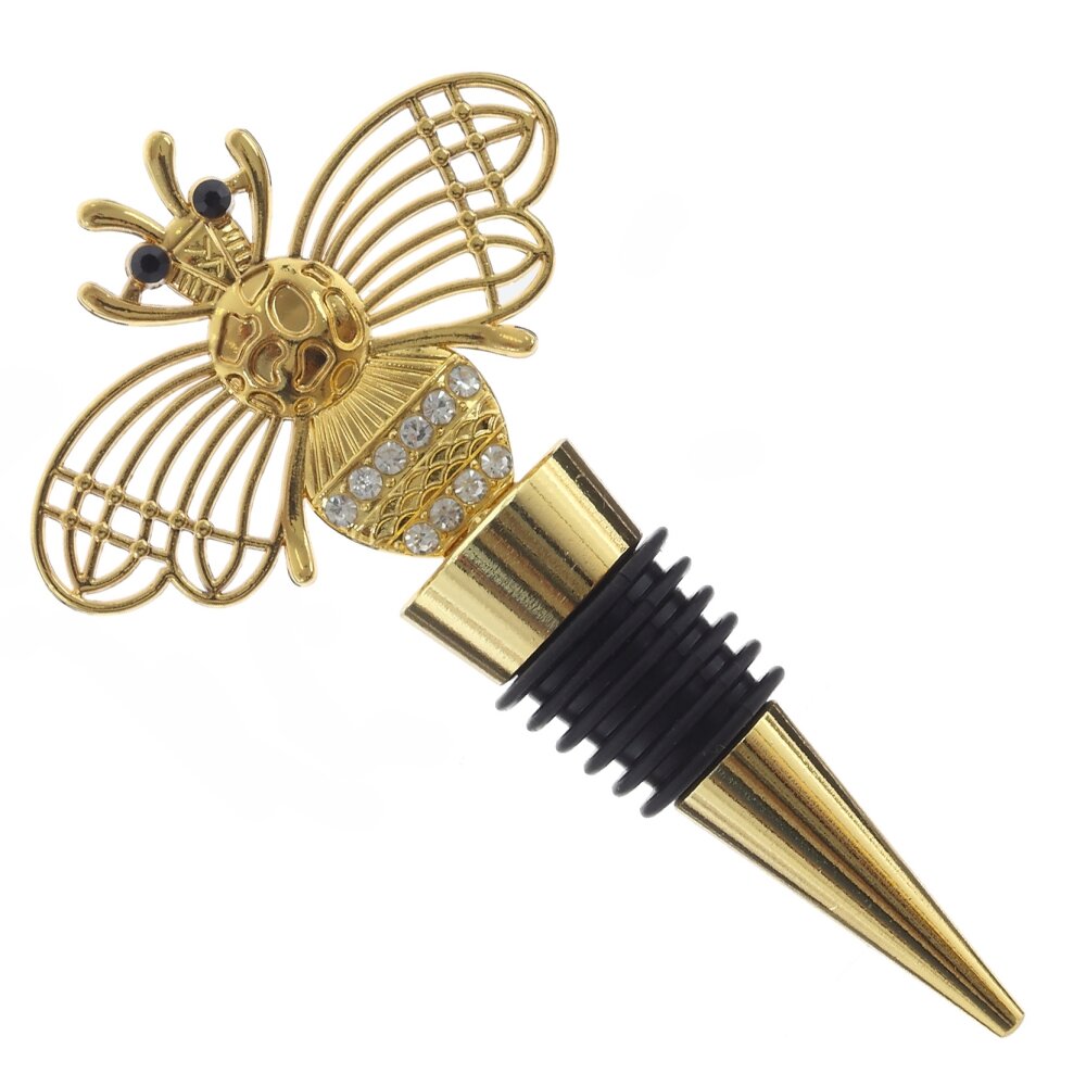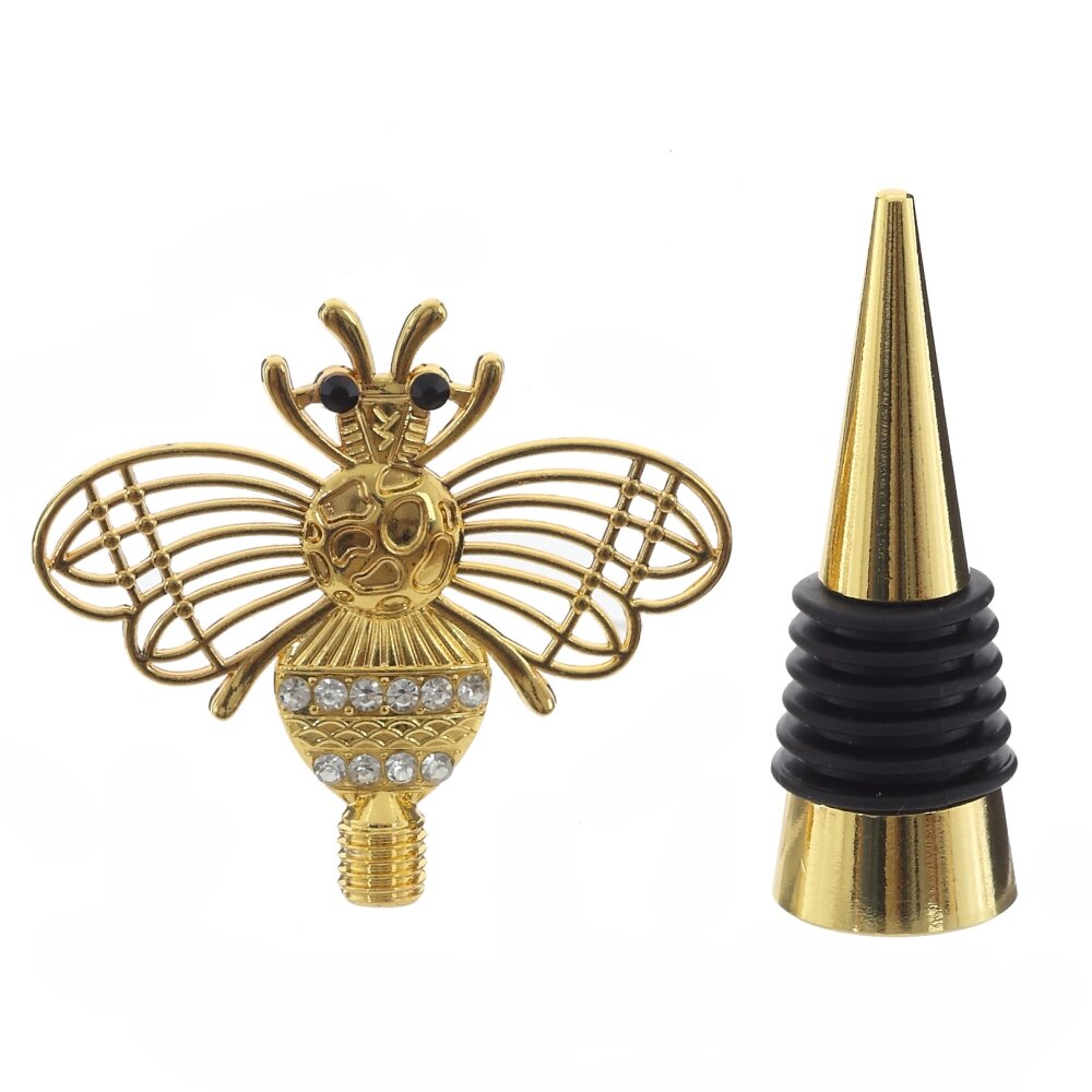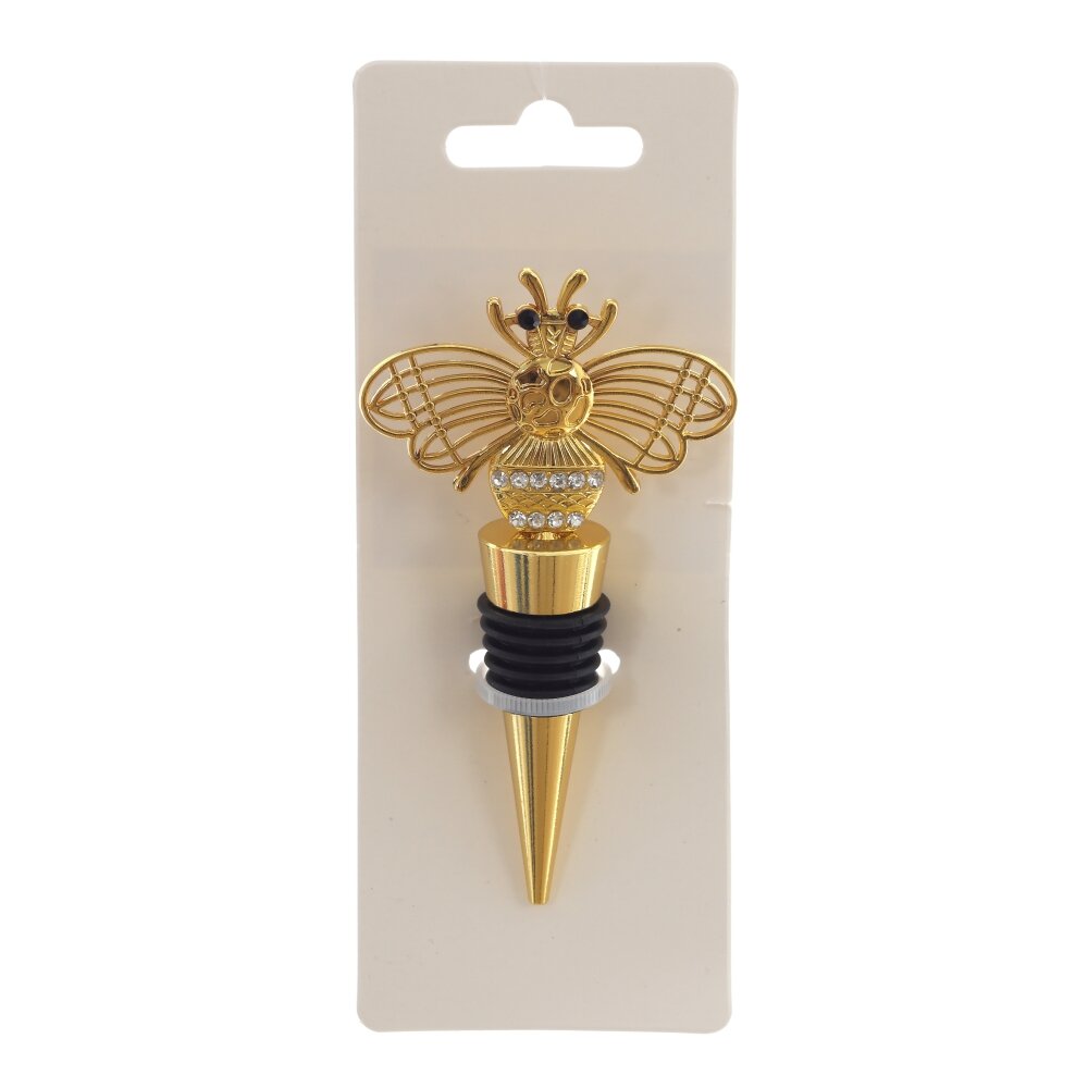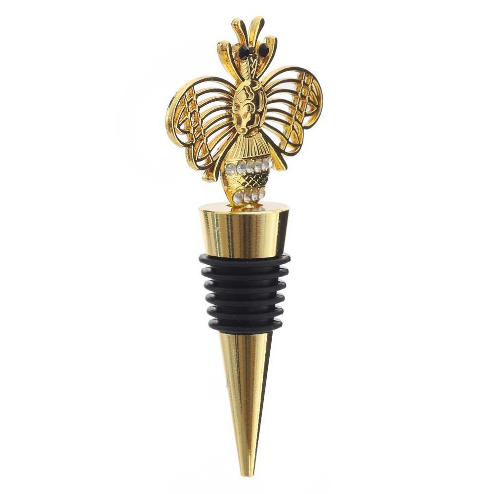 Декоративная пробка для бутылки в виде пчелы. Верхняя часть выполнена из металла с золотистым покрытием: ажурные крылья и фактурное тельце, украшенное стеклянными стразами, придают изделию эффектный вид. Рабочая часть — конический металлический сердечник с несколькими эластичными полимерными уплотнительными кольцами, которые обеспечивают плотную посадку и герметичность. Пробка подходит для стандартных стеклянных бутылок с вином, ликерами, бальзамами или маслами, защищает содержимое от выветривания аромата и случайного проливания. Многоразовая, проста в уходе и служит стильным акцентом сервировки.
