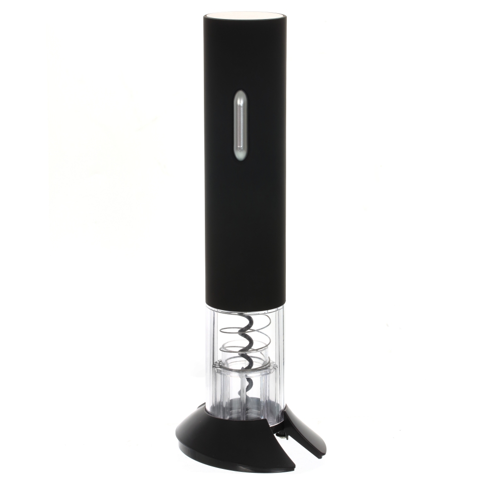 Винный штопор на батарейках позволяет выкручивать пробку из бутылки одним нажатием. Он работает с помощью четырех батареек типа АА (не прилагаются). Штопор имеет цилиндрическую форму. Визуально разделен на две части, верхнюю черную и нижнюю прозрачную. Основной материал аксессуара – прочный пластик и коррозионностойкая сталь. На корпусе присутствует кнопка управления.