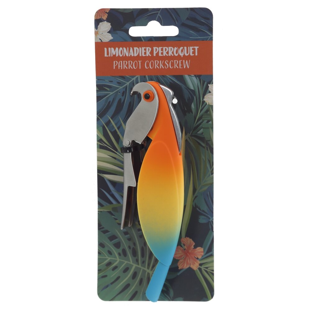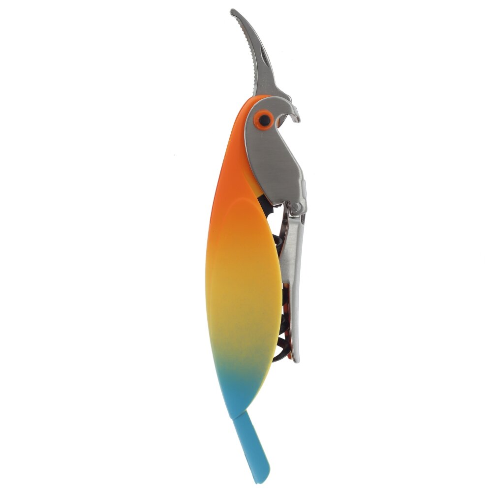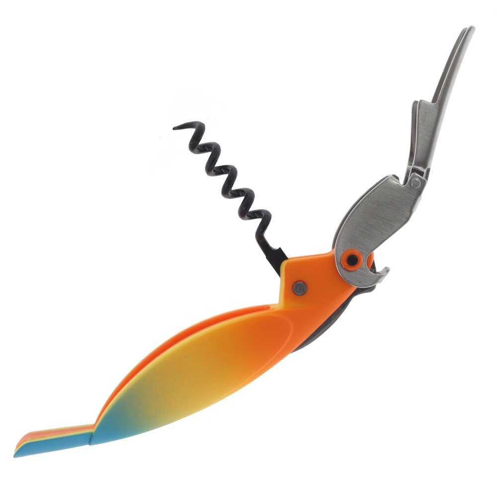Компактный штопор с ярким градиентным корпусом, напоминающим силуэт попугая. Рабочие элементы выполнены из коррозионностойкой стали: прочная спираль аккуратно входит в пробку, а двойной рычаг обеспечивает лёгкое извлечение без перекосов. Корпус из полимерных материалов эргономично лежит в руке и не скользит. Верхняя часть служит открывалкой для бутылок с пробкой-коронкой. Складная конструкция удобна и безопасна при хранении, подходит для дома, бара и пикника, проста в уходе и рассчитана на долгий срок службы.