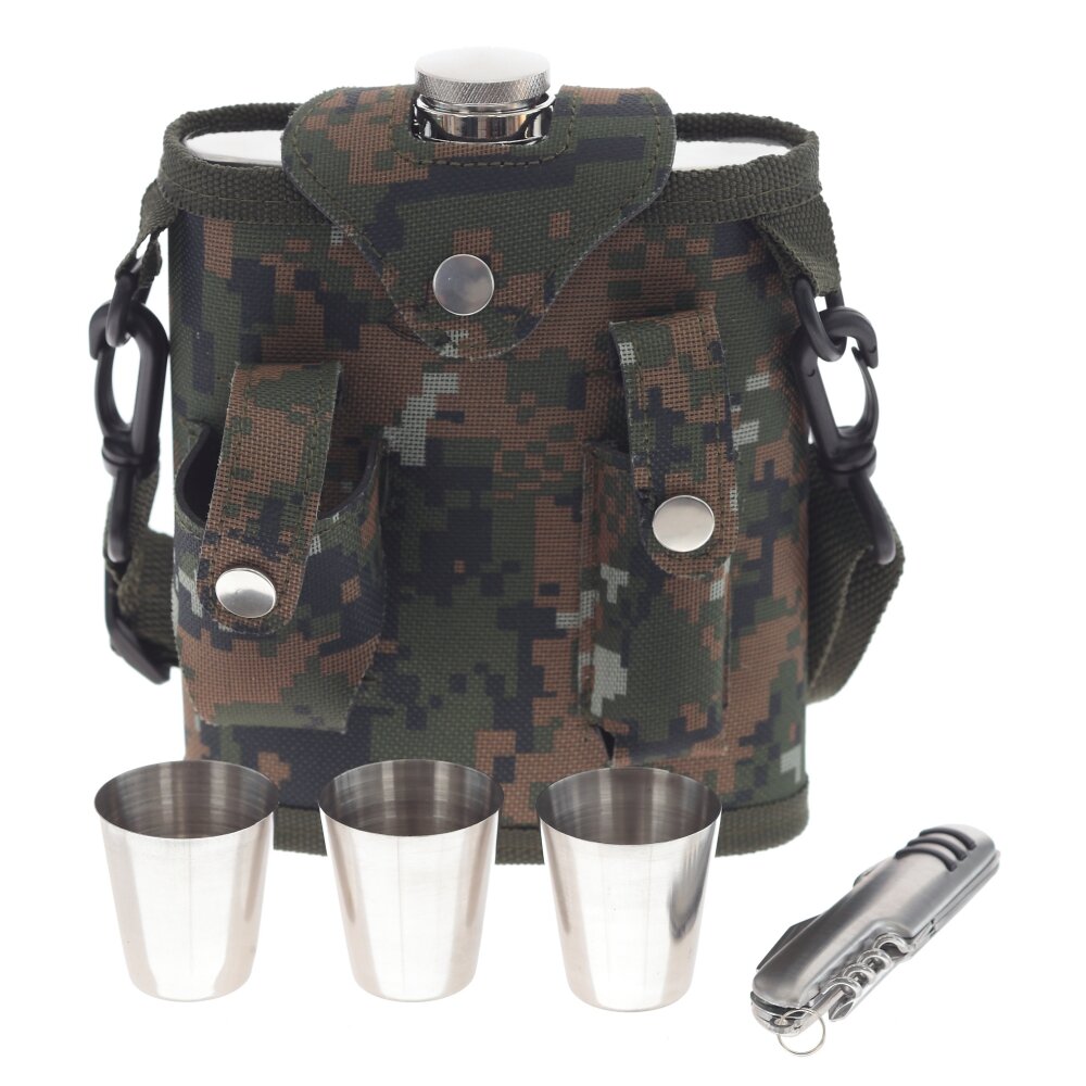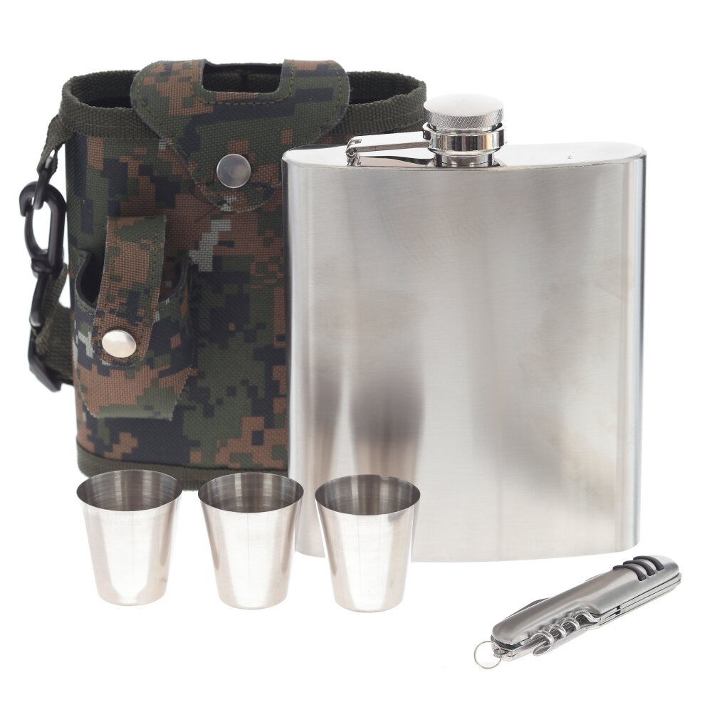 Удобный и компактный набор из 5-ти предметов, который станет отличным спутником для вас в любых походах, путешествиях или прогулках на природе. Фляжка вмещает до 500 мл жидкости и изготовлена из высококачественной коррозионностойкой стали, что обеспечивает долговечность и надежность использования. Три стопки позволят вам наслаждаться напитками и делиться ими со своими близкими или друзьями. В наборе также предусмотрен нож выполненный из качественной коррозионностойкой стали. Он является незаменимым аксессуаром при приеме пищи на природе, обеспечивая удобство и комфорт при еде. Весь набор удобно упаковывается в компактный чехол, который поможет сохранить все предметы в порядке и избежать их случайного повреждения. Выбирая этот набор, вы получаете надежное и удобное решение для путешествий и отдыха на природе, которое будет служить вам долгое время. Стопка: 4*4*4 см, 30 мл, 11 г. Нож: 3*1*9,5 см, 56 г.