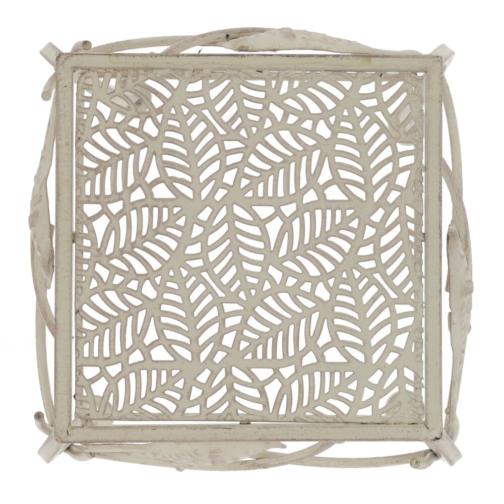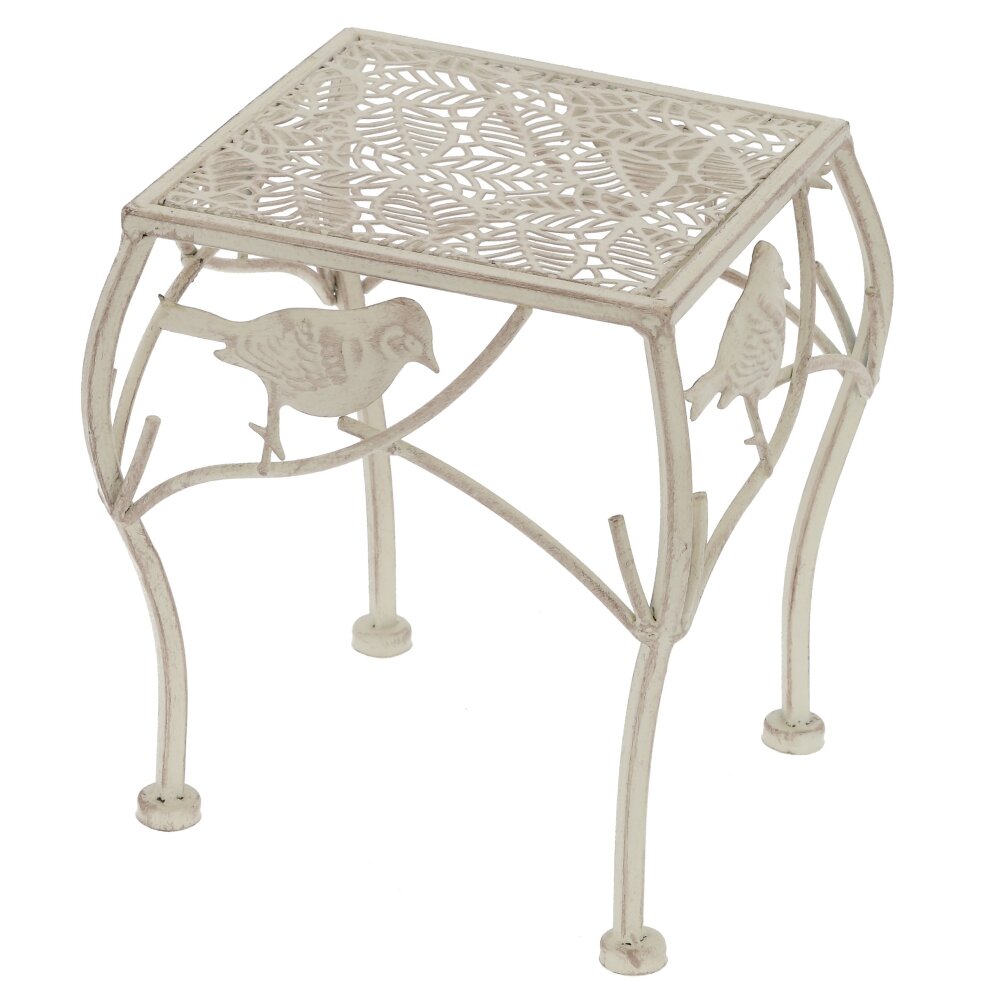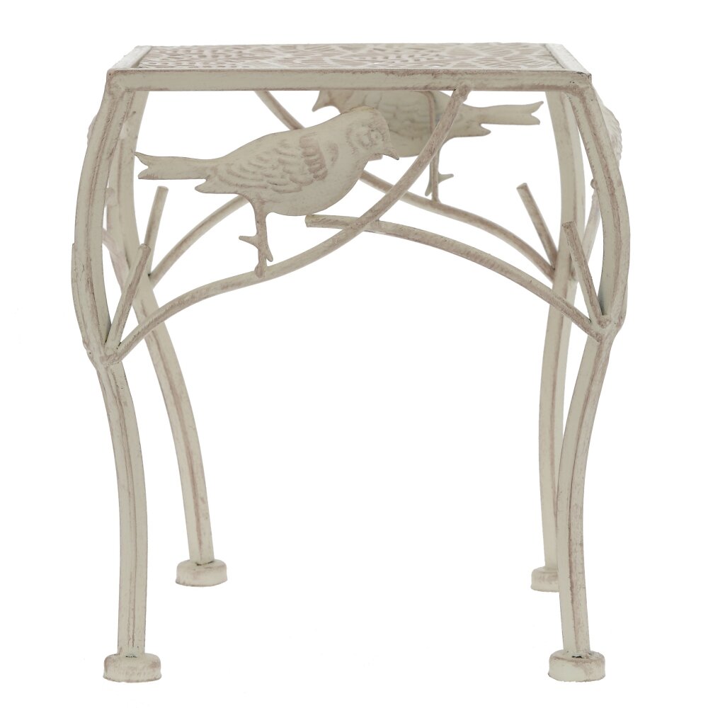 Элегантная металлическая подставка для цветов в винтажном стиле станет изюминкой любого интерьера. Изделие выполнено из прочного металла с декоративной окраской в светлом оттенке. Ажурная квадратная столешница с растительным орнаментом обеспечивает устойчивое размещение горшков, а изящно изогнутые ножки придают конструкции лёгкость и устойчивость. Боковины украшены фигурками птиц и веточек, создающих атмосферу уюта и сада в доме. Подставка идеально подойдёт для размещения комнатных растений, ваз, декоративных композиций на балконе, в гостиной, на террасе или в зимнем саду. Компактный размер позволяет использовать её как отдельно, так и в сочетании с другими подставками, создавая многоуровневую цветочную зону. Прочный металл обеспечивает долговечность и простоту ухода.