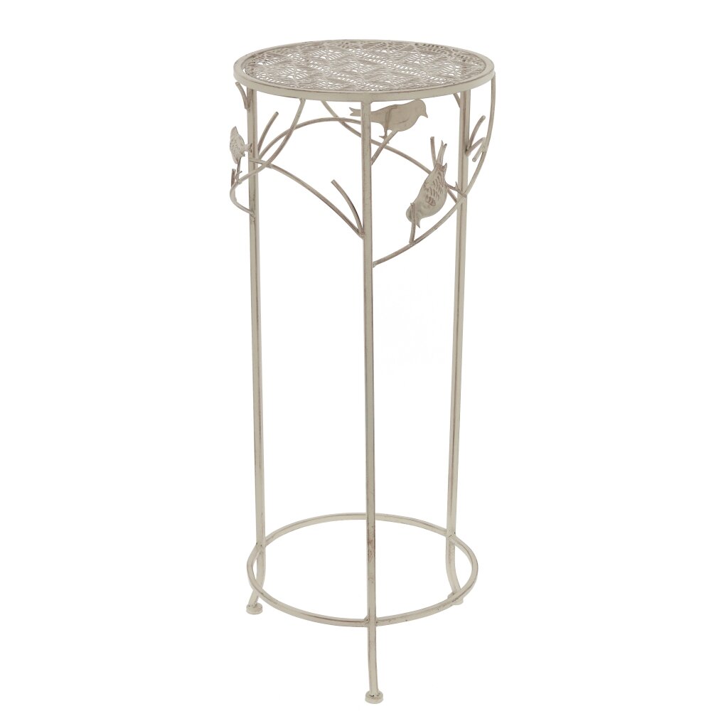 Элегантная металлическая подставка для цветов с круглой ажурной столешницей — изящное решение для оформления интерьера. Высокая тонкая конструкция визуально легкая, но прочная и устойчивая благодаря круговому основанию и четырём опорам. Боковины украшены декоративными ветвями с фигурками птичек, что придаёт подставке романтичный, «садовый» характер и делает её акцентным элементом в комнате, на балконе или в зимнем саду. Светлый оттенок металла органично вписывается в интерьеры в стиле прованс, кантри, шебби?шик и классика. Подставка подходит для размещения комнатных растений в горшках, декоративных композиций и сувениров, помогает выгодно приподнять цветок и создать многоуровневую зелёную зону. Легко переносится и не требует сложного ухода.