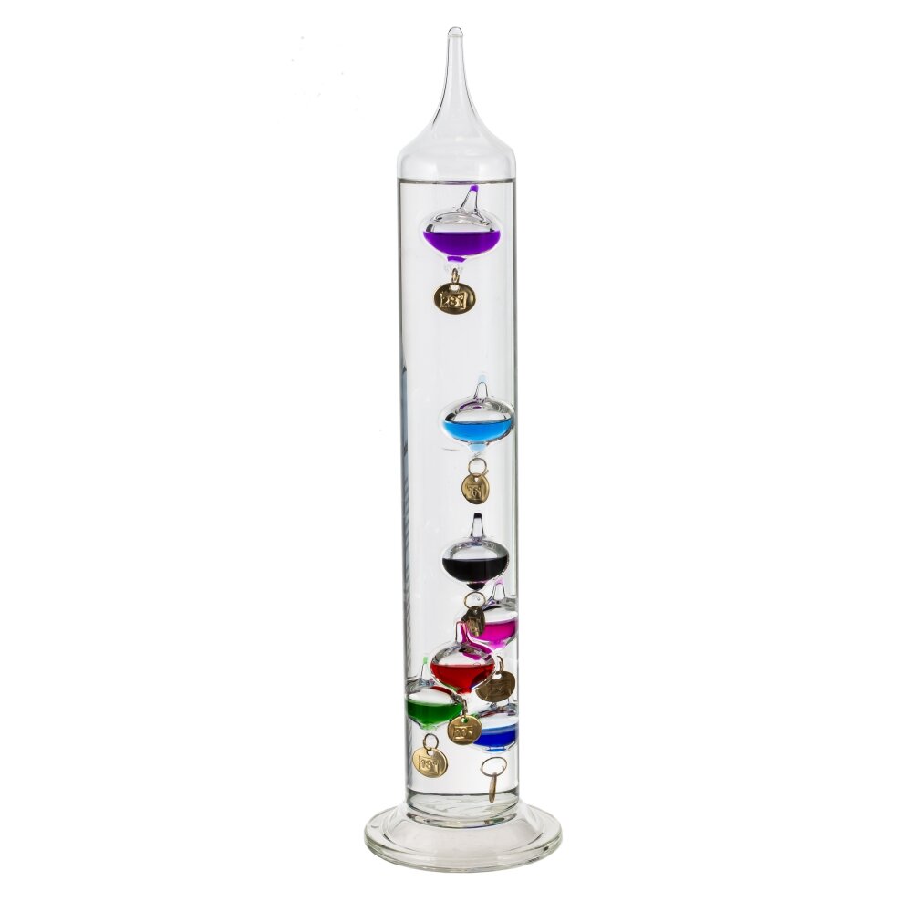 Элегантный термометр Галилея из прозрачного стекла — функциональный и декоративный предмет интерьера. Цилиндрическая колба с утолщённым основанием заполнена жидкостью, внутри плавно перемещаются разноцветные стеклянные капсулы с металлическими бирками?грузиками. Каждая капсула откалибрована по плотности, поэтому при нагреве или охлаждении одни всплывают, другие опускаются. Температуру считывают по самой нижней из плавающих в верхнем слое капсул. Типичный диапазон измерений — около 18–26 °C. Изделие герметично, выполнено из качественного стекла, гармонично смотрится в кабинете, гостиной или на рабочем столе, добавляя интерьеру научный акцент. Рекомендуется беречь от ударов и прямых солнечных лучей, протирать мягкой тканью.