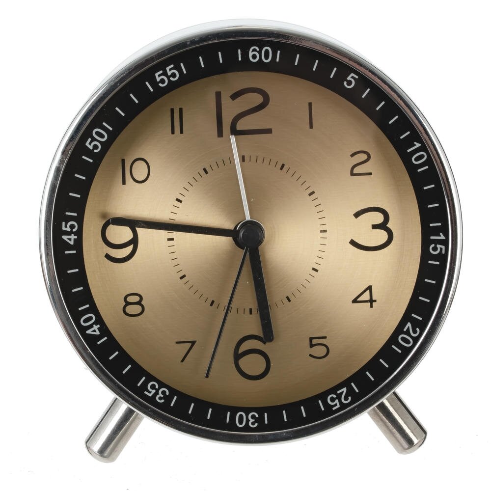 Стильный настольный будильник с лаконичным круглым корпусом станет ярким акцентом на прикроватной тумбе, рабочем столе или полке. Размер часов: длина 11 см, ширина 5 см, высота 12 см, диаметр циферблата 8,5 см, вес 237 гр. Корпус из прочного металла с хромированным покрытием гармонично сочетается с золотистым циферблатом под прозрачным стеклом. Крупные арабские цифры и контрастные стрелки обеспечивают хорошую читаемость времени даже издалека. Надёжные полимерные элементы защищают внутренний механизм и продлевают срок службы изделия. Будильник работает от двух батареек типа АА (в комплект не входят), не требует подключения к сети и удобен для использования дома, в офисе или в поездках. Компактный размер, устойчивые ножки и современный ретро-дизайн делают его практичным и стильным аксессуаром для любого интерьера. Компактные размеры позволяют разместить будильник на тумбочке, столе или полке, не занимая много места. Эти часы станут отличным подарком для близких и друзей, а также прекрасным украшением для собственного дома или офиса. Они подчеркнут индивидуальность и хороший вкус своего владельца.