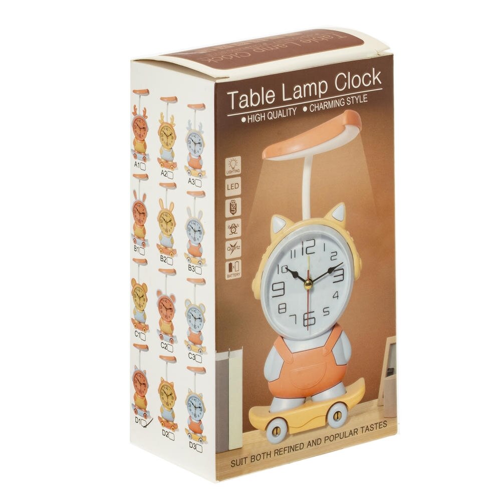 Часы-будильник выполнены из качественных материалов, обеспечивающих долговечность и надежность. Основной цвет часов персиковый, штанишки выполнены в желтом цвете, скейт и наушники нежно-голубого цвета.