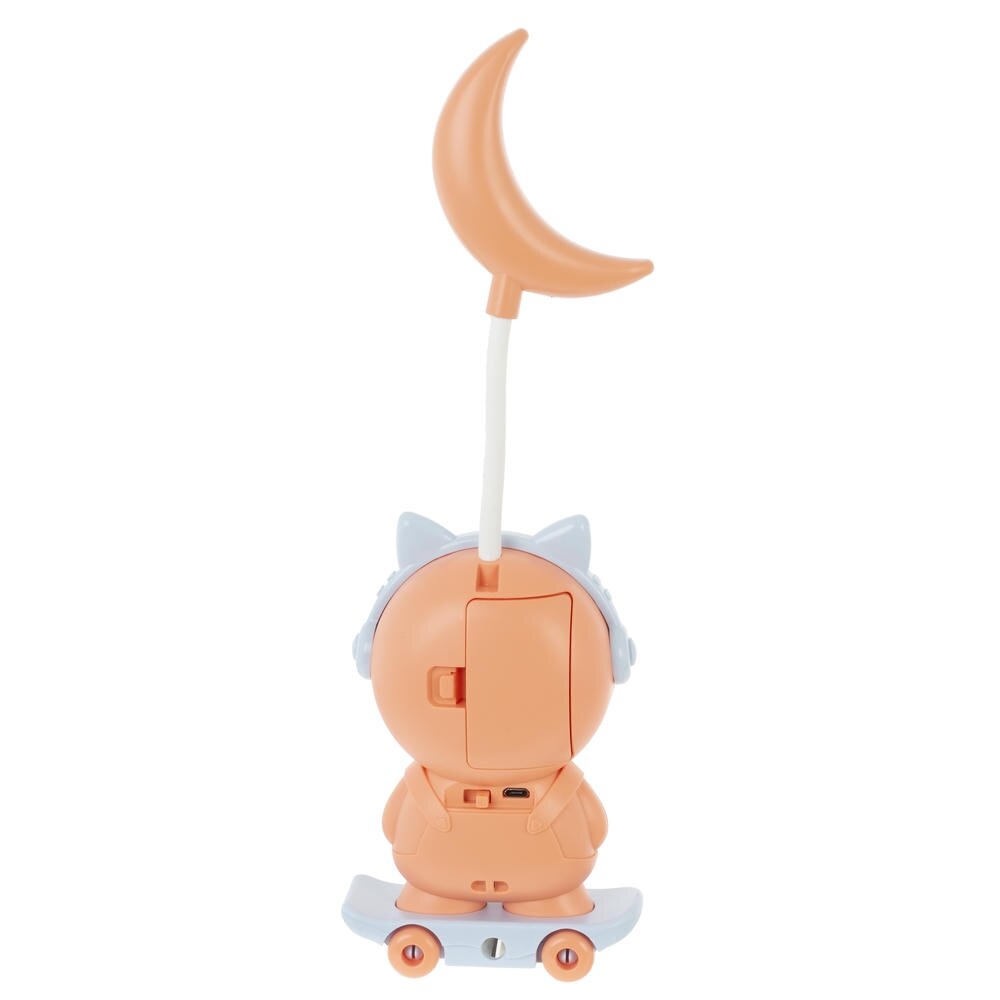 Детский будильник в форме котика на скейте станет стильным элементом вашего интерьера и незаменимым помощником в организации времени. Над головой котенка размещен ночник в форме месяца. Ночник имеет 2 яркости освещения. Яркость регулируется рычажком сзади.