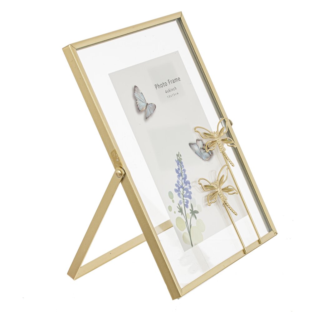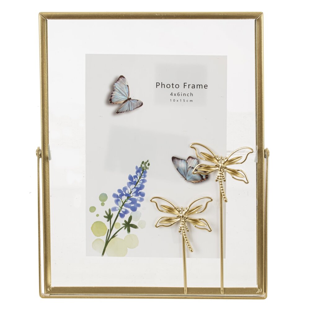 Элегантная фоторамка для фото размером 15?20 см выполнена из стекла и металла, что придаёт ей изысканный и стильный внешний вид. Прозрачное стекло создает эффект "парящей" фотографии, а металлическая окантовка золотистого оттенка добавляет оттенок роскоши и утончённости. Дополнительным украшением являются металлические декоративные элементы в виде стрекоз, придающие рамке романтичный и природный мотив. Такая фоторамка станет замечательным дополнением интерьера, подчеркнёт важные моменты и стильный вкус владельца. Отличный подарок на разные случаи жизни.