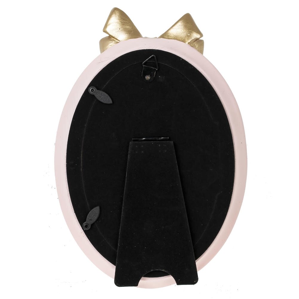 Овальная фоторамка для фото 10?15 см выполнена из прочных полимерных материалов с лицевой стеклянной панелью, надежно защищающей снимок от пыли и повреждений. Нежно?розовая основа дополнена декоративным золотистым бантом в верхней части, что придает изделию изящный, немного сказочный вид. Такая рамка станет красивым акцентом в интерьере детской комнаты, спальни или гостиной, подчеркнёт важные семейные моменты, первые фотографии малыша или любимые портреты. Удобная конструкция позволяет легко вставлять и менять фото, а нейтральная цветовая гамма гармонично сочетается с большинством стилей оформления дома.