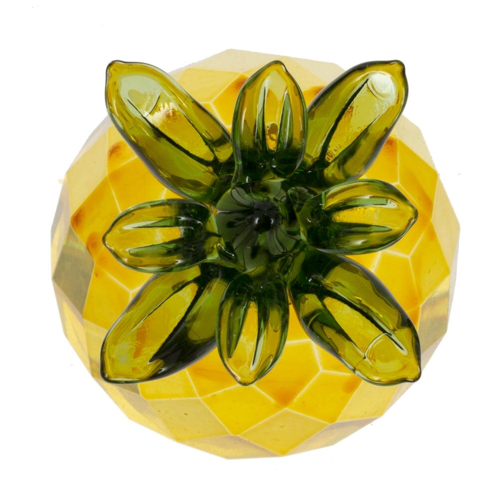 Декоративная фигурка «Ананас» – изящный акцент для интерьера, который привнесёт в пространство нотку тропической свежести и уюта. Изделие высотой 6,5 см выполнено из цветного стекла: корпус ананаса выполнен в виде огранённого кристалла насыщенного жёлтого оттенка, красиво переливается и отражает свет, создавая игру бликов. Верхняя часть оформлена резными зелёными листочками, придающими фигурке реалистичный и в то же время стильный вид. Компактный размер позволяет использовать аксессуар на рабочем столе, туалетном столике, в витрине, на полке или прикроватной тумбе. Подойдёт в качестве небольшого, но запоминающегося подарка и элемент декора в гостиной, спальне, кухне или офисе.