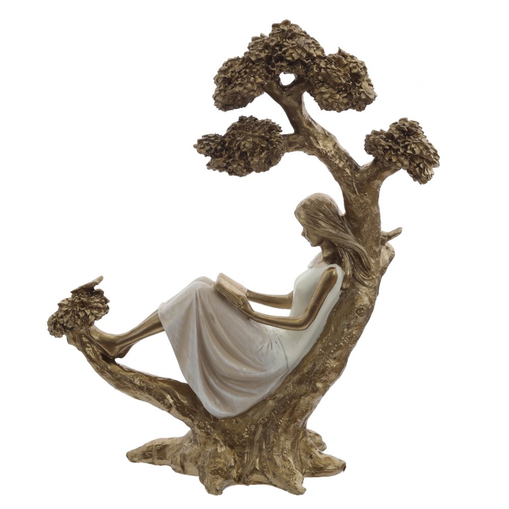Декоративная фигурка Девушки с книгой под деревом – изящный акцент для гостиной, спальни или кабинета. Размер интерьерной статуэтки: высота 25 см, длина 20 см, ширина 9,5 см, изготовлена из качественных полимерных материалов. Скульптура изображает стройную девушку в длинном светлом платье, удобно устроившуюся в ветвях раскидистого дерева с книжкой в руках. Золотистая фактура ствола и кроны с проработанными деталями создаёт ощущение теплого солнечного света, а мягкие линии силуэта придают композиции спокойствие и гармонию. Фигурка выполнена из прочного материала (полистоун), устойчива и не требует сложного ухода — достаточно периодически протирать от пыли. Идеально подойдёт как интерьерное украшение в стиле классика, модерн или прованс, а также станет символичным подарком для любителей чтения, романтической атмосферы и уюта дома. Статуэтка это небольшой, но значимый знак внимания близким на день рождения, новый год или 8 марта и 23 февраля. Украсьте свой дом стильным интерьерным украшением, добавив в дом атмосферу любви и согласия.
