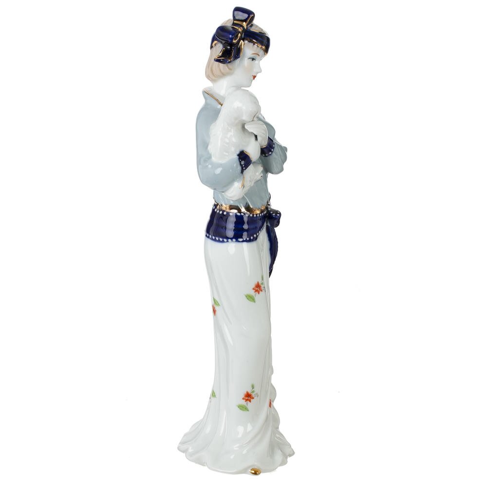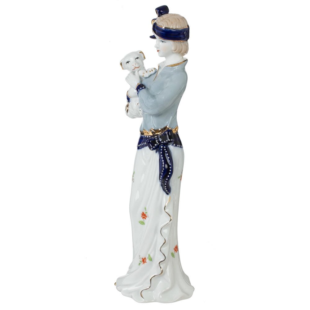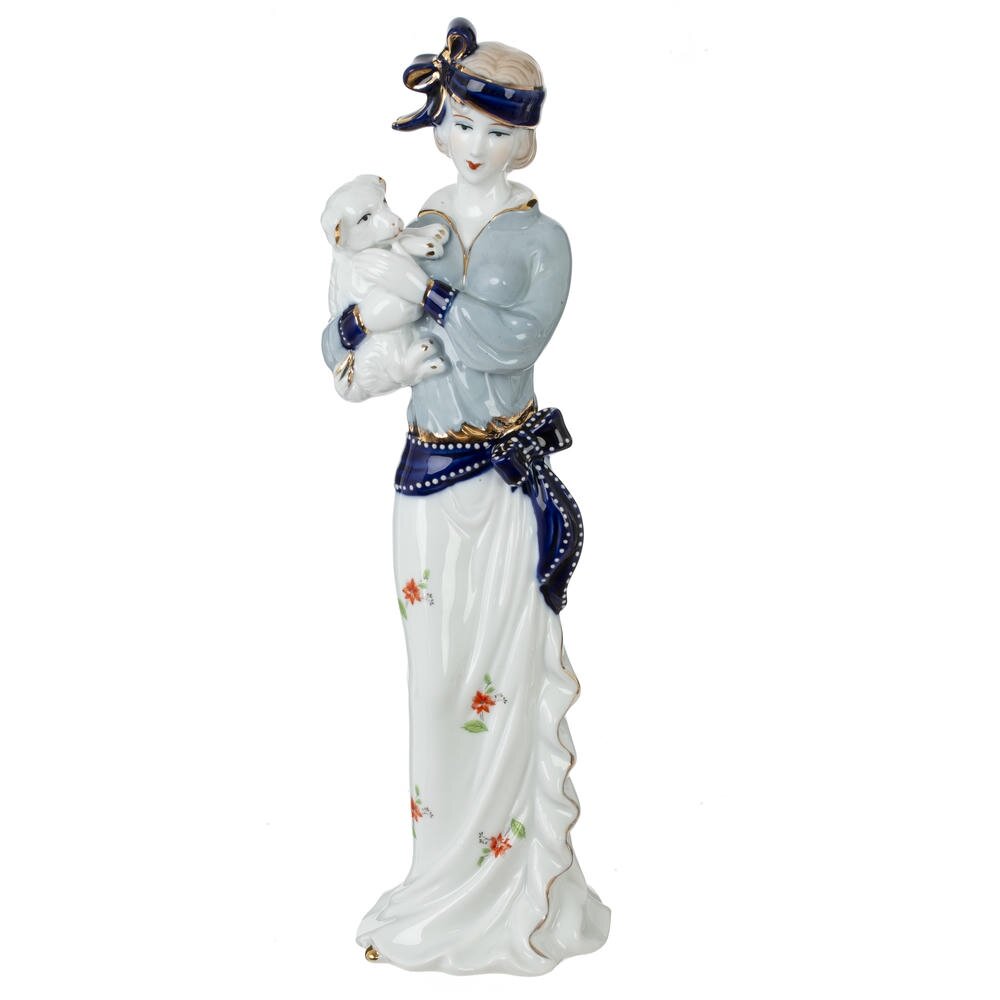Декоративная фарфоровая фигурка «Девушка» станет изящным акцентом вашего интерьера и подчеркнёт утончённый вкус хозяйки дома. Стройная девушка в лёгкой белой юбке с цветочным рисунком и голубой блузе бережно держит на руках маленького щенка, создавая атмосферу нежности и уюта. Образ дополняют темно-синий пояс и повязка на голове с аккуратной бантовой отделкой. Гладкая глянцевая поверхность, плавные линии силуэта и деликатные золотистые акценты придают изделию благородный, почти коллекционный вид. Фигурка идеально подойдёт для гостиной, спальни или витрины, а также станет приятным подарком любителям изысканного декора и классического фарфора.