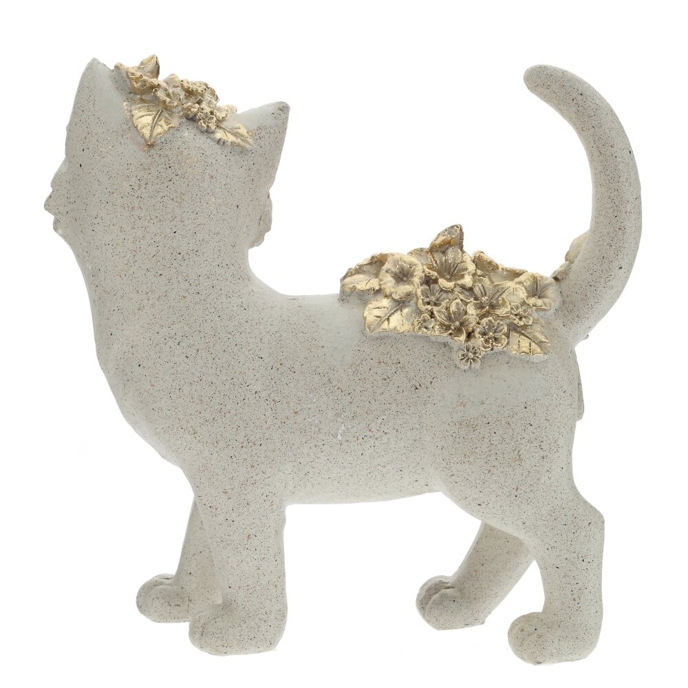 Декоративная фигурка «Кошка» станет изящным акцентом в интерьере и удачным подарком для любителей домашних животных. Выполненная из прочных полимерных материалов, она имитирует поверхность светлого камня и декорирована объемными цветами благородного золотистого оттенка на спинке и голове. Детально проработанные лепестки и плавные линии силуэта придают изделию утончённость и создают ощущение ручной работы. Фигурка гармонично впишется в классический, прованский или романтический стиль, украшая полку, камин, подоконник или рабочий стол.
