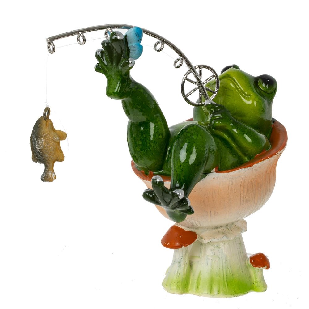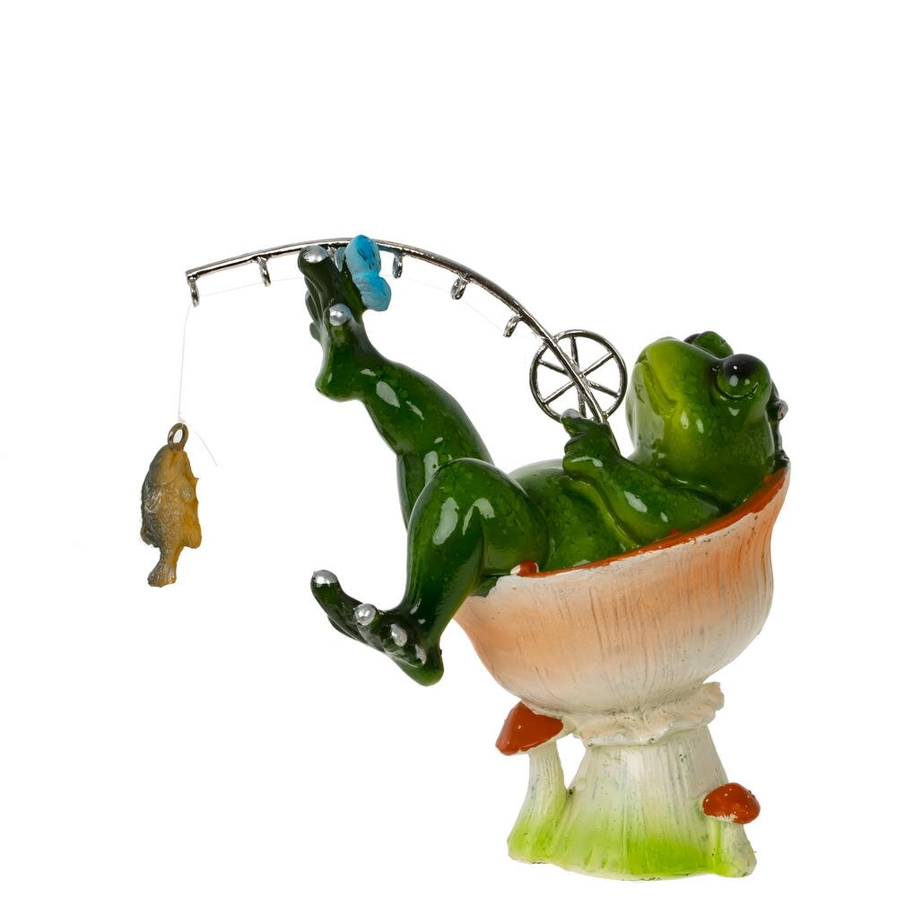 Декоративная фигурка из полимерных материалов в виде забавной лягушки-рыбака. Зеленая лягушка удобно расположилась в импровизированном кресле-грибочке, закинув ногу на ногу и держа в лапах изящное удилище с подвешенной на леске рыбкой. Яркие глянцевые краски, аккуратная проработка деталей и юмористический сюжет создают игривое настроение и притягивают внимание. Фигурка станет оригинальным украшением дома, офиса, дачи или сада, подчеркнет любовь хозяина к природе и рыбалке, а также послужит милым сувениром для друзей и близких. Легко сочетается с другими декоративными элементами и не требует особого ухода. Яркой, невероятно позитивной и обаятельной фигурке лягушки в качестве подарка на день рождения, 8 марта или 23 февраля будут рады и взрослые и дети. Сделайте оригинальный подарок для себя или близких.
