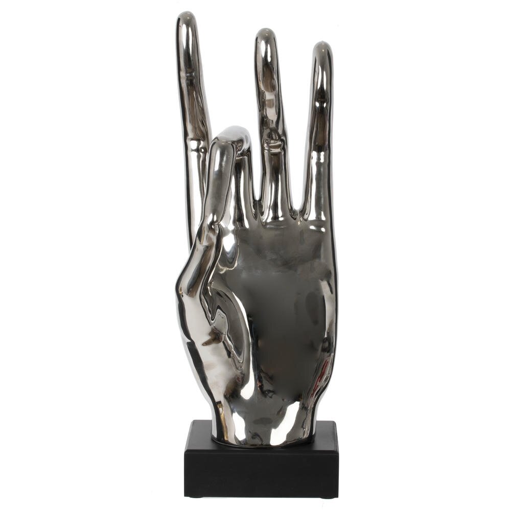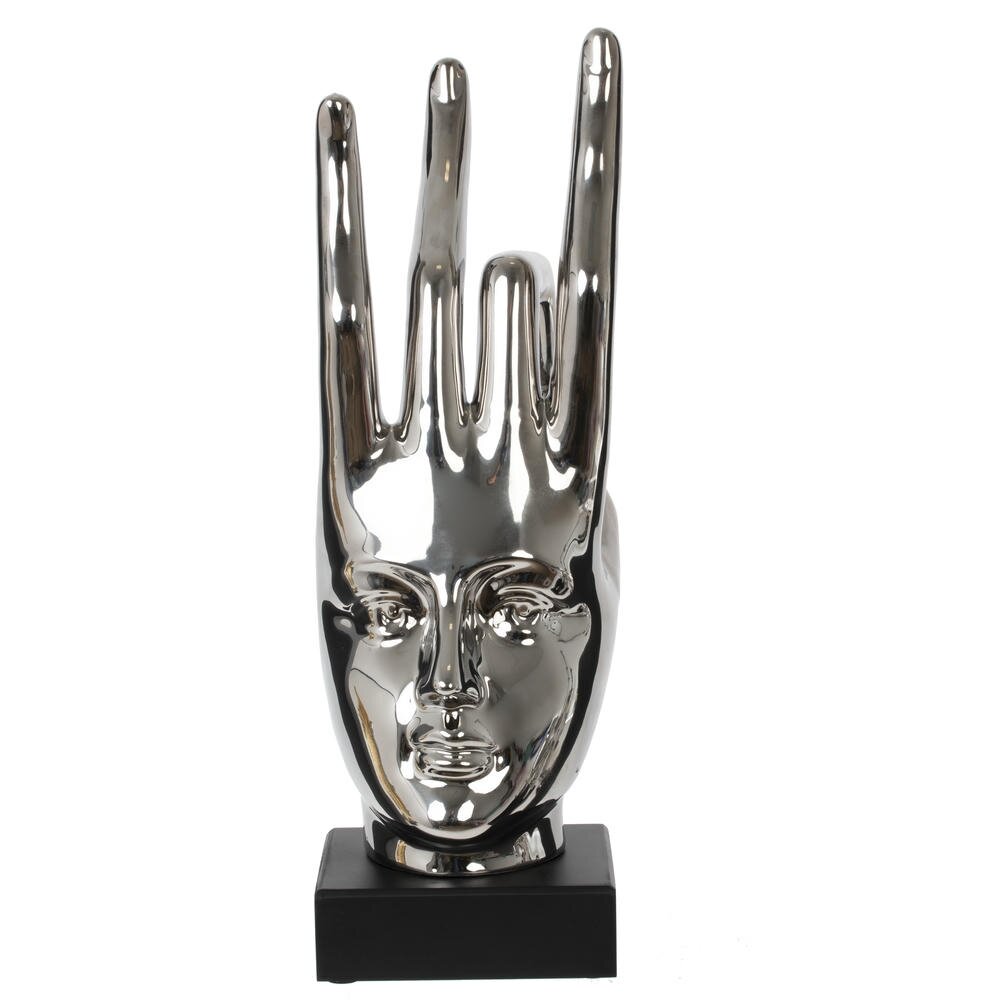 Декоративная фигурка в виде стилизованной человеческой руки – эффектный акцент для современного интерьера. Гладкая зеркальная поверхность с хромированным блеском привлекает внимание и красиво отражает свет, создавая интересные блики на полке или рабочем столе. Жест руки придаёт композиции динамику и делает её оригинальным арт-объектом, который легко становится центром композиции в гостиной, кабинете, на ресепшене или в креативном офисе. Фигурка установлена на лаконичной чёрной подставке, что обеспечивает устойчивость и позволяет гармонично сочетать её с другими элементами декора в стилях лофт, минимализм, модерн и хай?тек. Подойдёт в качестве нестандартного подарка для друзей, коллег или любителей необычных интерьерных решений.