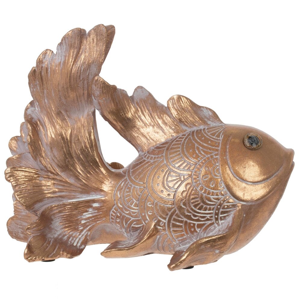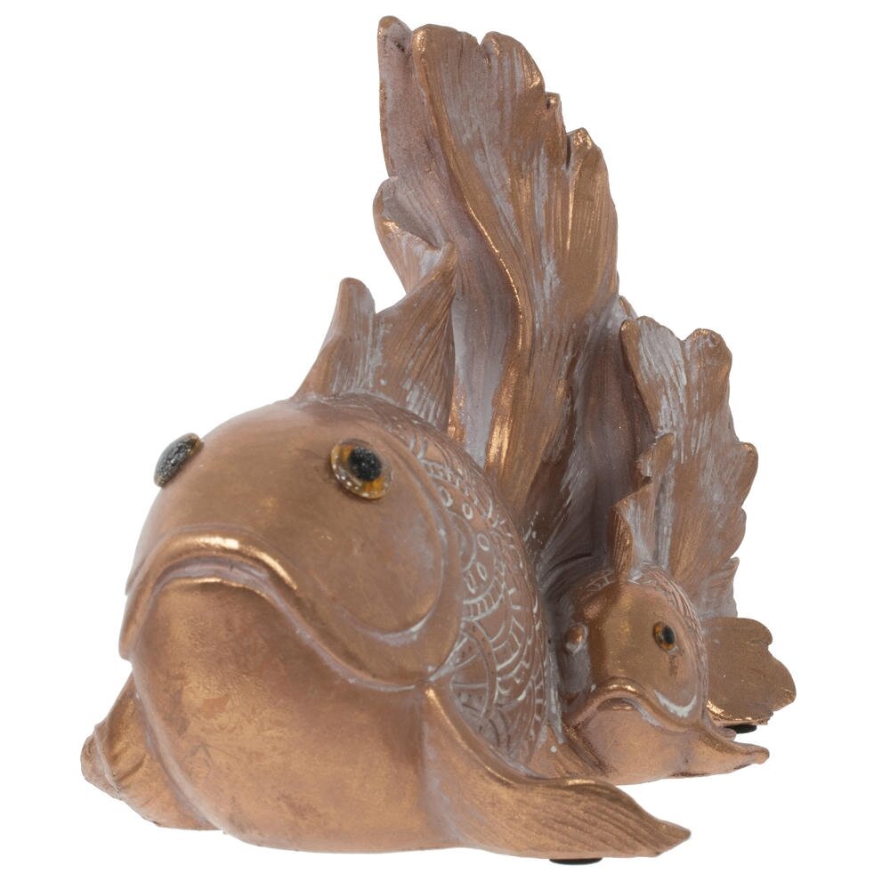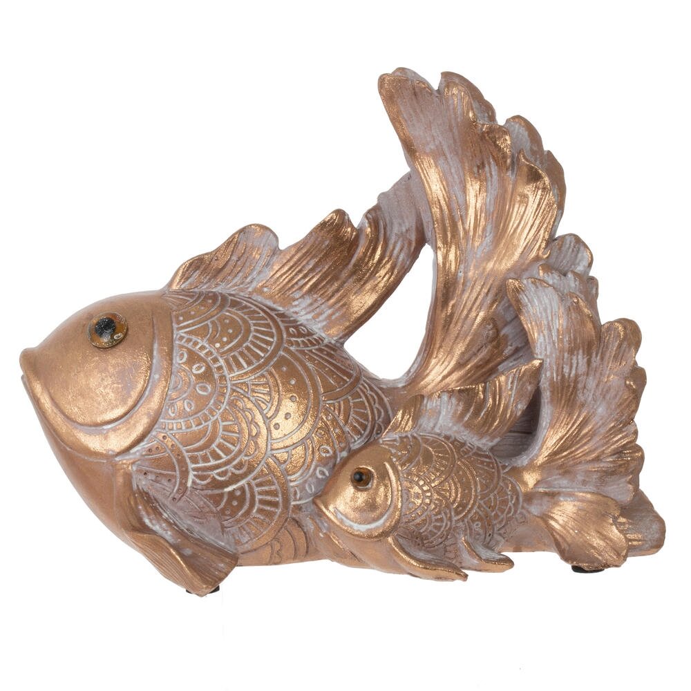Декоративная фигурка в виде двух изящных рыбок станет эффектным акцентом в любом интерьере. Крупная рыба с распахнутым хвостом оберегает маленькую, создавая ощущение гармонии, достатка и семейного уюта. Поверхность украшена тонким рельефным орнаментом, напоминающим кружевную чешую, что придаёт изделию выразительность и благородство. Тёплое золотистое покрытие с мягким перламутровым отливом красиво играет на свету и подчёркивает каждый изгиб плавников. Фигурка отлично подойдёт для гостиной, спальни, рабочего кабинета или зоны отдыха, а также станет символичным подарком к новоселью, свадьбе или любому торжеству. Такое украшение легко впишется как в классический, так и в современный интерьер, придавая ему нотку изысканности и отражая вкус владельца.