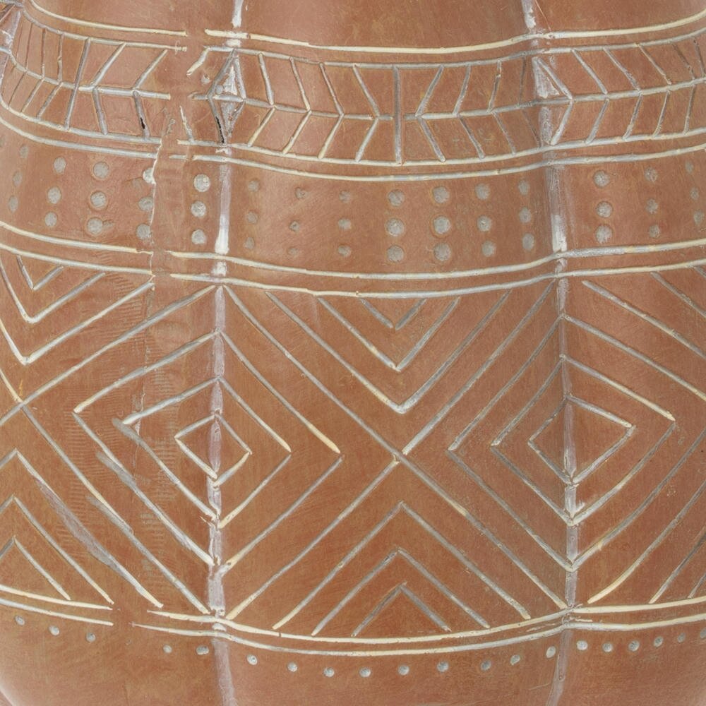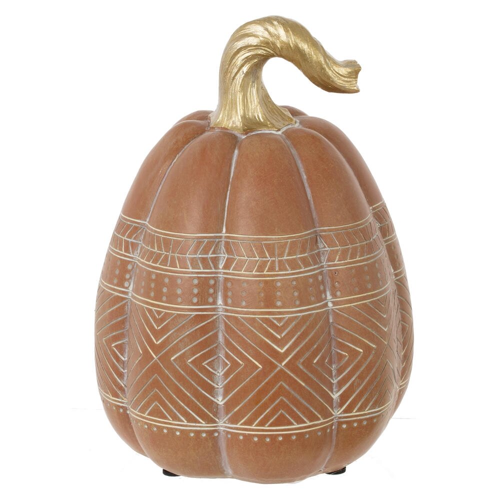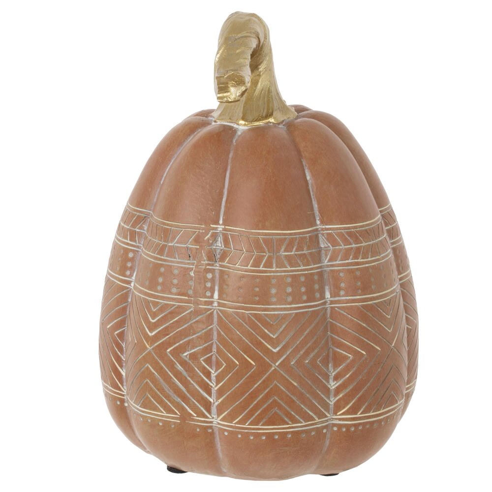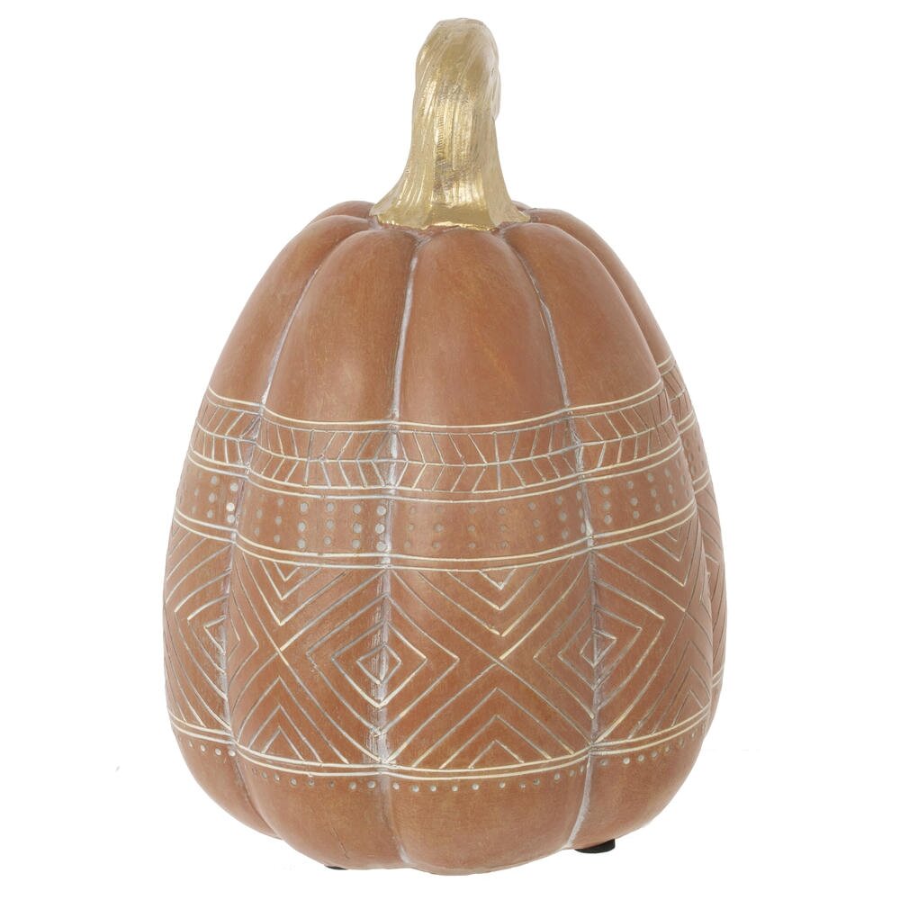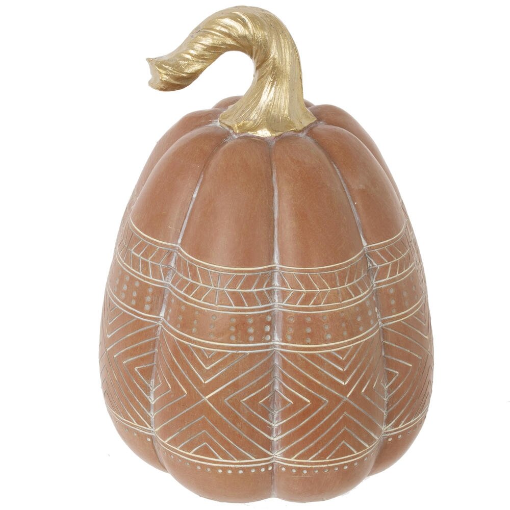 Декоративная фигурка в форме тыквы из качественных полимерных материалов станет ярким акцентом в любом интерьере. Матовая поверхность теплого терракотового оттенка дополнена изящной гравировкой: геометрический орнамент с треугольниками плавно переходит в полосу стилизованных цветов. Контрастный золотистый хвостик придаёт изделию нарядный, немного сказочный вид. Лёгкая, устойчивая и неприхотливая в уходе фигурка идеально подходит для оформления гостиной, кухни, каминной полки или праздничного стола в осеннем стиле, а также для создания уютной композиции с подсвечниками и вазами.