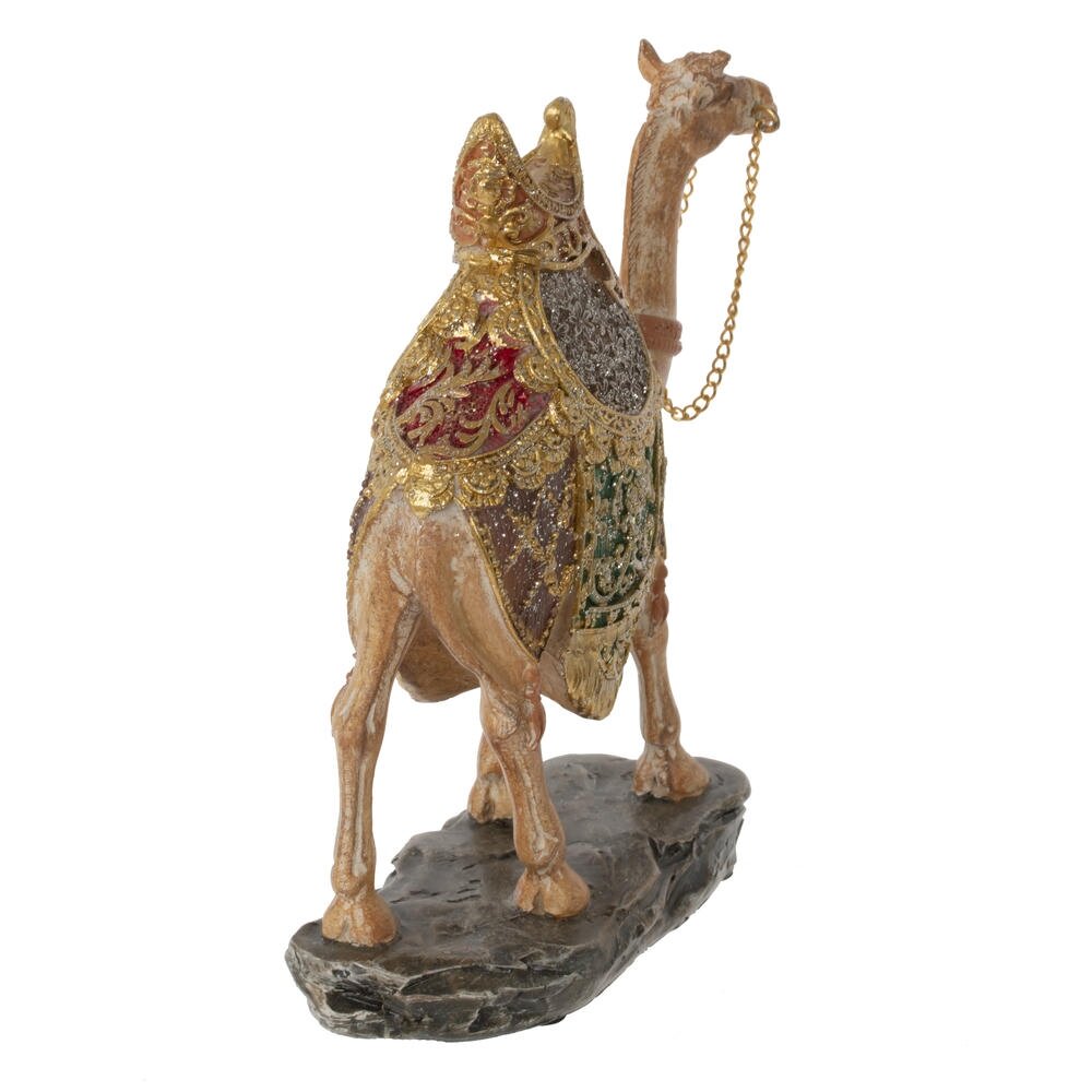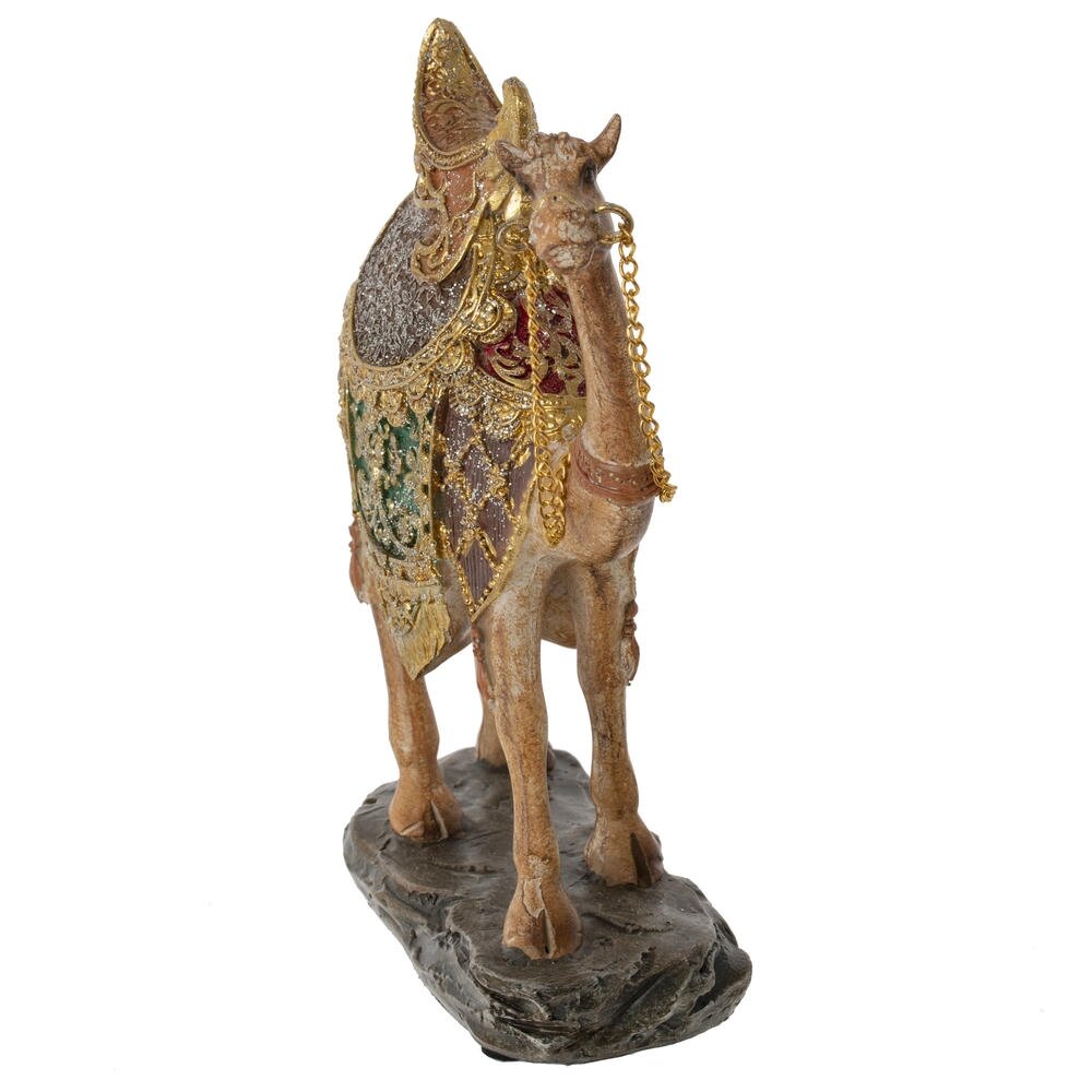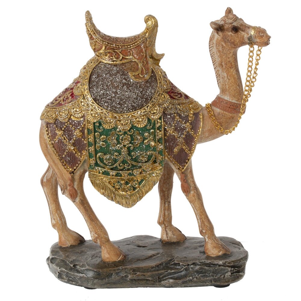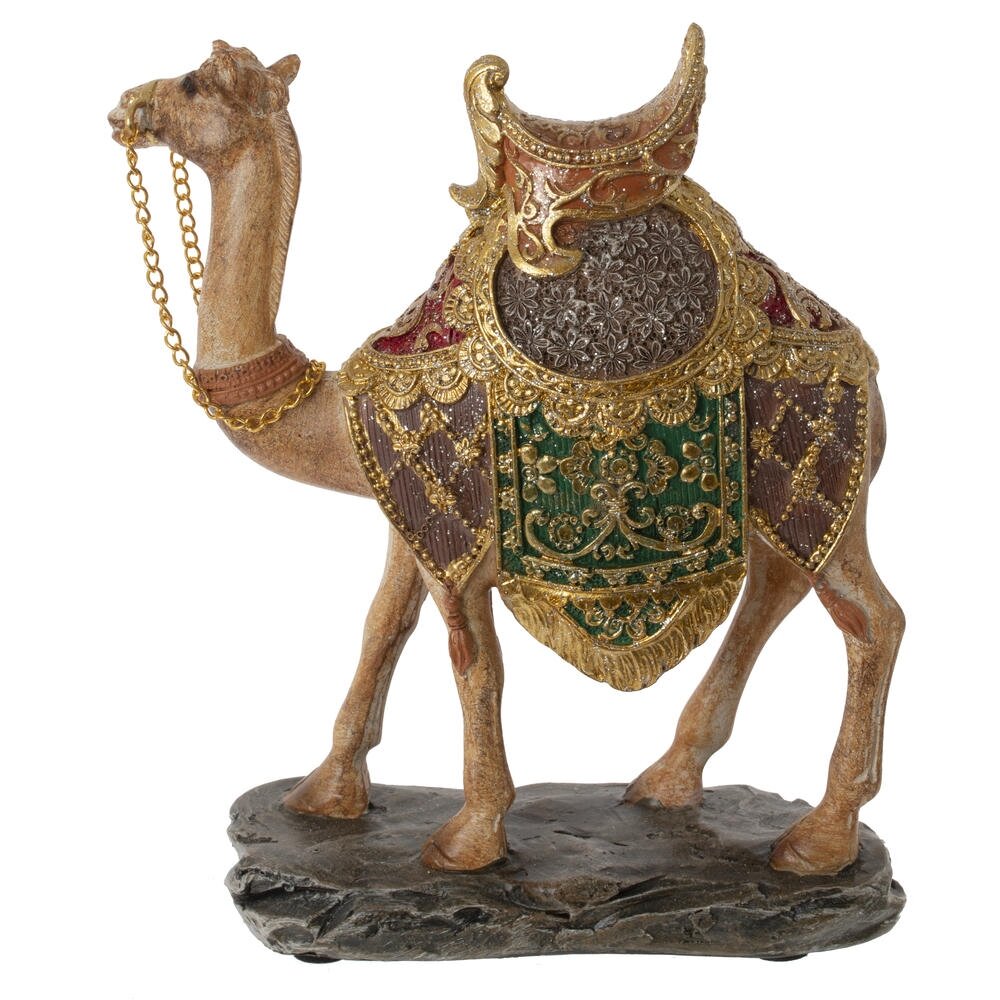 Декоративная фигурка верблюда из полимерных материалов – эффектный акцент для интерьера в восточном или классическом стиле. Размеры декоративной статуэтки: длина 12 см, ширина 5 см, высота 16 см. Животное изображено в движении, установлено на фактурном постаменте, имитирующем камень. Тело верблюда покрыто роскошной упряжью с рельефным орнаментом: накидка выполнена в зелёно?бордовых тонах с обилием золотистых деталей и мерцающих элементов, богато декорированное седло дополнено изящной цепочкой. Тщательно прорисованные складки кожи, морда и ноги создают реалистичный образ. Такая фигурка станет выразительным украшением полки, каминной полки или витрины, а также оригинальным подарком ценителям необычных интерьерных аксессуаров и восточной тематики. Стильный аксессуар для любителей необычного декора и оригинальный подарок к любому празднику. Такая фигурка также может стать прекрасным подарком для любителей животных, а также для тех, кто ценит красоту и элегантность в дизайне. Фигурка декоративная это подарок, который будет приятен всем, кто любит украшать свой дом необычными вещами.