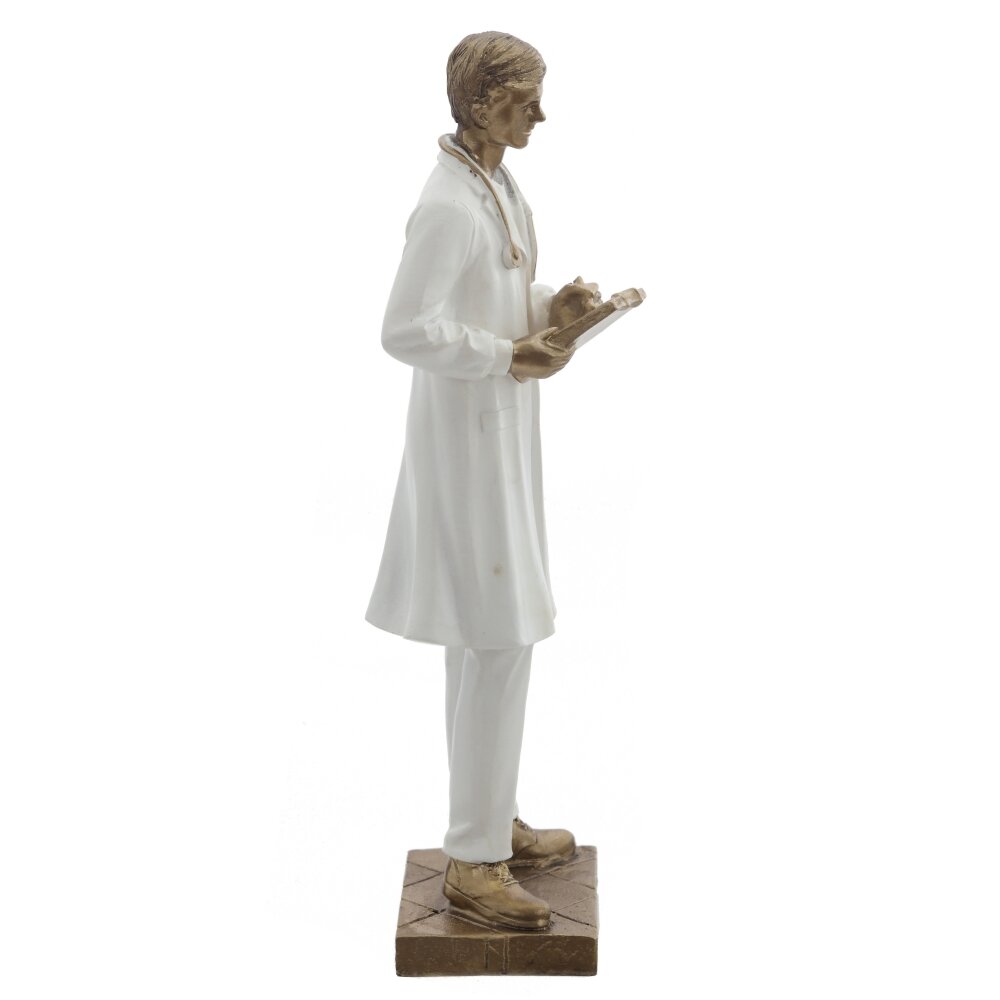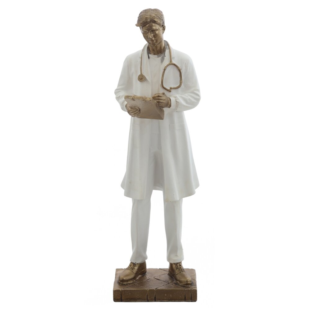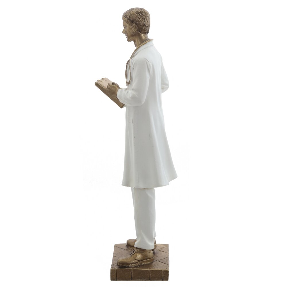 Фигура мужчины-доктора в белом халате с золотистыми деталями и стетоскопом передает образ внимательного и заботливого специалиста. В руках он держит папку с записями, что символизирует профессионализм и ответственность. Фигурка выполнена с аккуратной прорисовкой складок одежды и мимики. Нейтральная бело-золотая гамма легко впишется в современный офис, приемную, домашний кабинет или книжную полку. Фигурка установлена на устойчивом прямоугольном основании, хорошо смотрится на рабочем столе, полке или в витрине. Это отличный вариант подарка врачу, студенту-медику, преподавателю или коллеге на профессиональный праздник, день рождения или в знак благодарности за заботу и помощь.