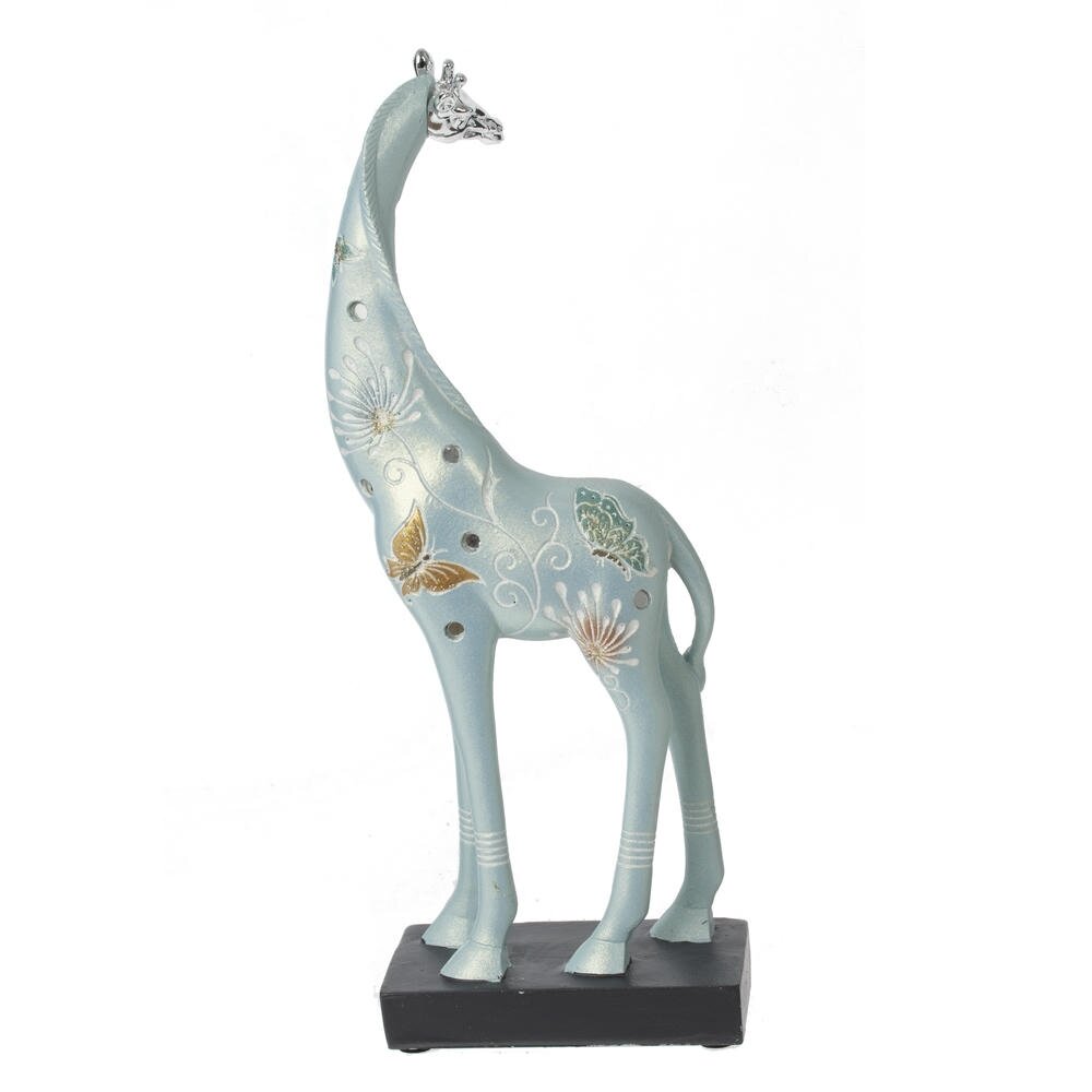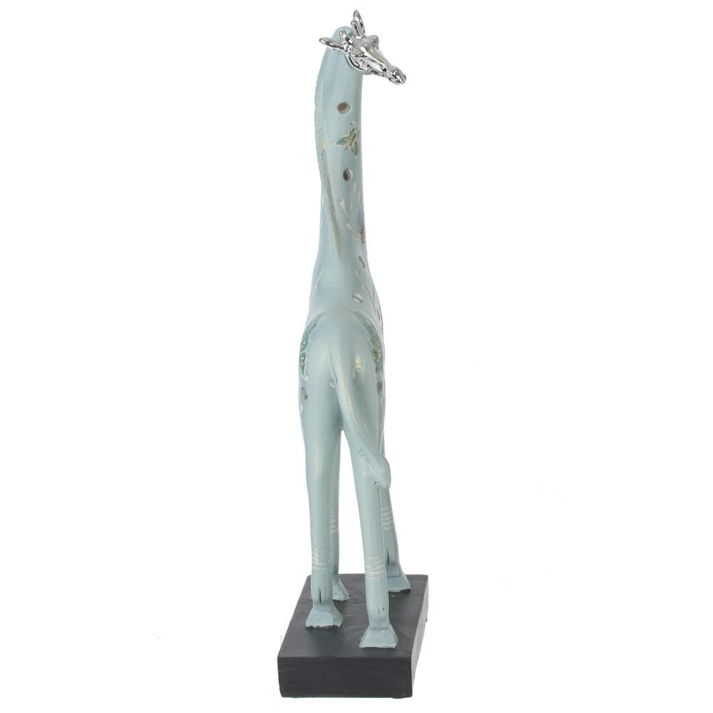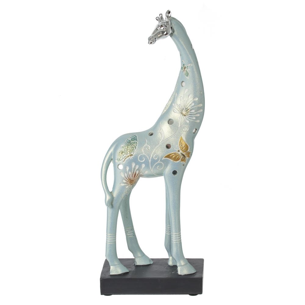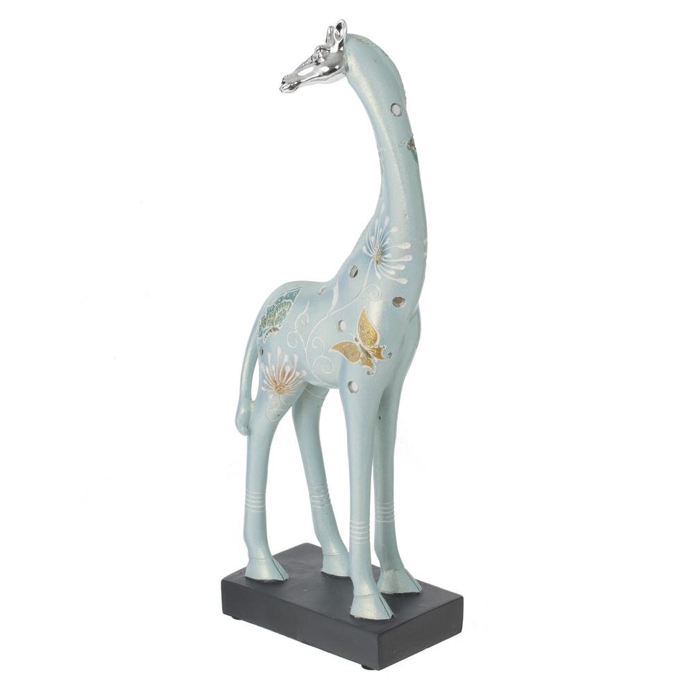 Элегантная декоративная фигурка жирафа станет ярким акцентом в интерьере гостиной, спальни или детской комнаты. Размеры декоративной статуэтки выполненной из полимерного материала: длина 10 см, ширина 7 см, высота 28 см. Статуэтка выполнена в нежном голубом оттенке с изящной росписью в виде цветов и листьев, дополнена сквозными декоративными отверстиями, создающими легкий, воздушный образ. Серебристая голова придаёт фигурке благородный, современный вид и выгодно контрастирует с матовым тоном корпуса. Жираф установлен на устойчивое тёмное основание, благодаря чему его удобно размещать на полке, комоде или подоконнике. Стильный аксессуар для любителей необычного декора и оригинальный подарок к любому празднику. Такая фигурка также может стать прекрасным подарком для любителей животных, а также для тех, кто ценит красоту и элегантность в дизайне. Фигурка декоративная это подарок, который будет приятен всем, кто любит украшать свой дом необычными вещами.