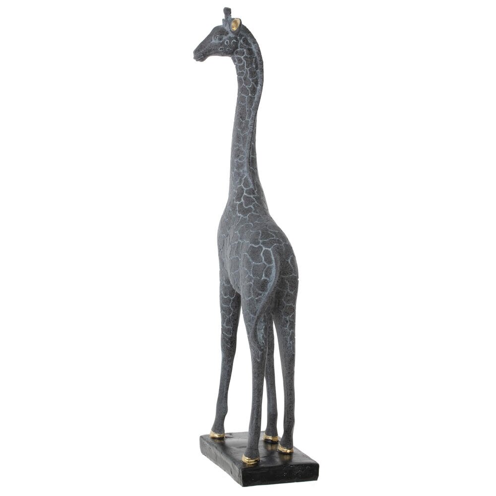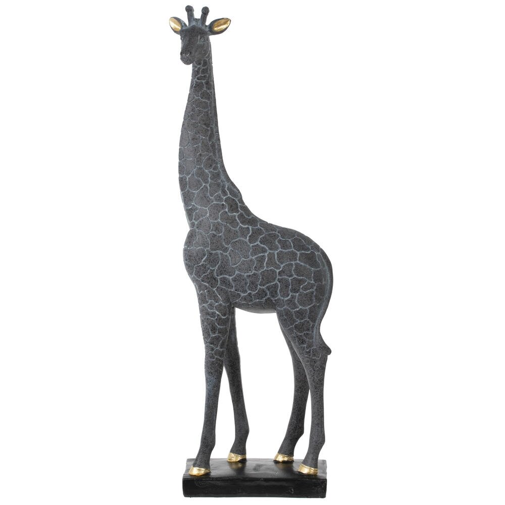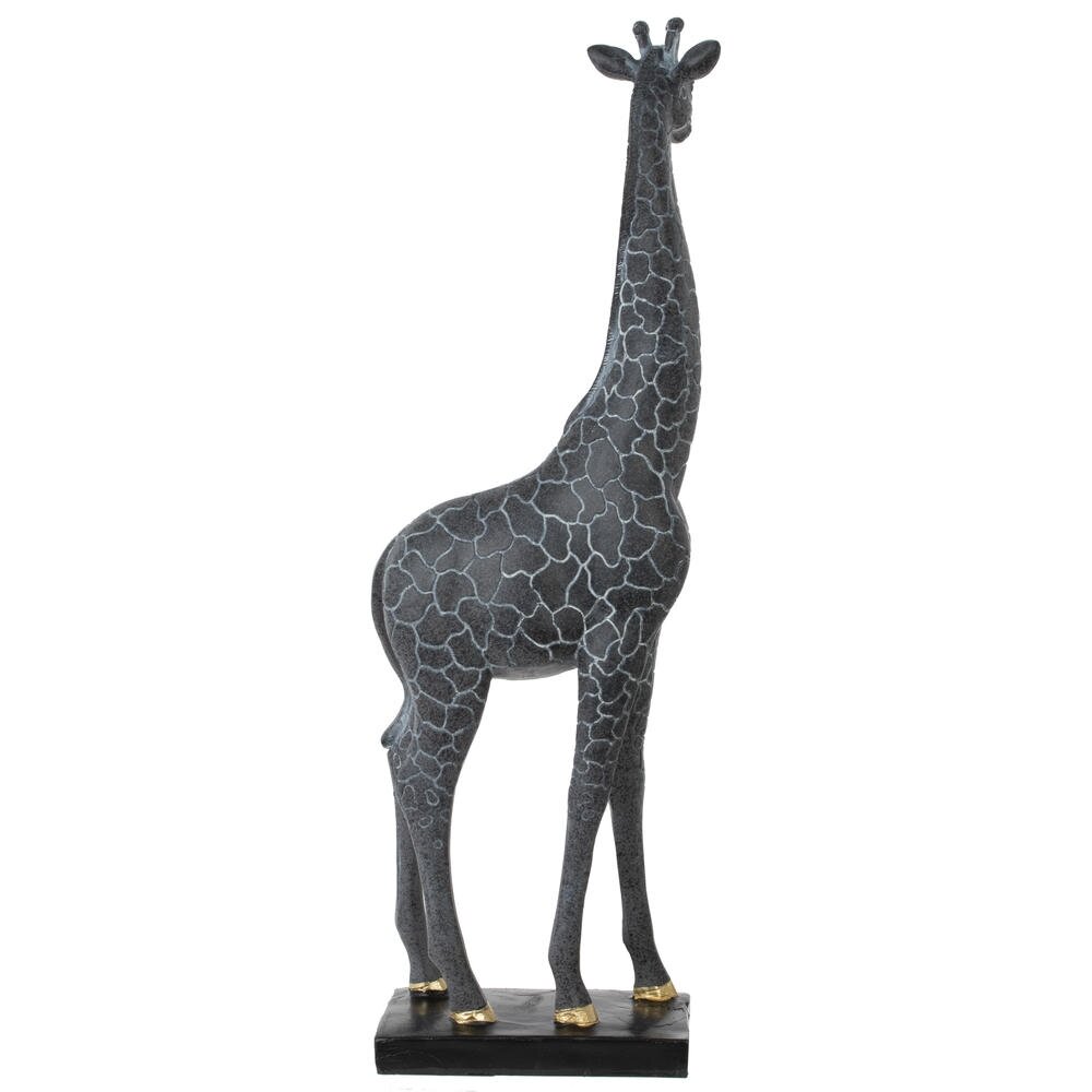 Фигурка декоративная "Жираф". Изысканная декоративная фигурка жирафа станет элегантным акцентом в интерьере вашего дома или офиса. Эта статуэтка выполнена с особым вниманием к деталям и отличается утонченным дизайном. Представляет собой грациозного жирафа в полный рост на устойчивой подставке. Основной цвет фигурки - благородный темно-серый с характерным сетчатым узором, имитирующим природную окраску животного. Особую изысканность изделию придают золотистые акценты на ушах, рогах и копытах, создающие эффектный контраст с темным корпусом. Фигурка отличается реалистичными пропорциями: длинная изящная шея, стройные ноги и характерный силуэт африканского животного переданы с художественной точностью. Текстурная поверхность с рельефным узором добавляет объем и глубину композиции.