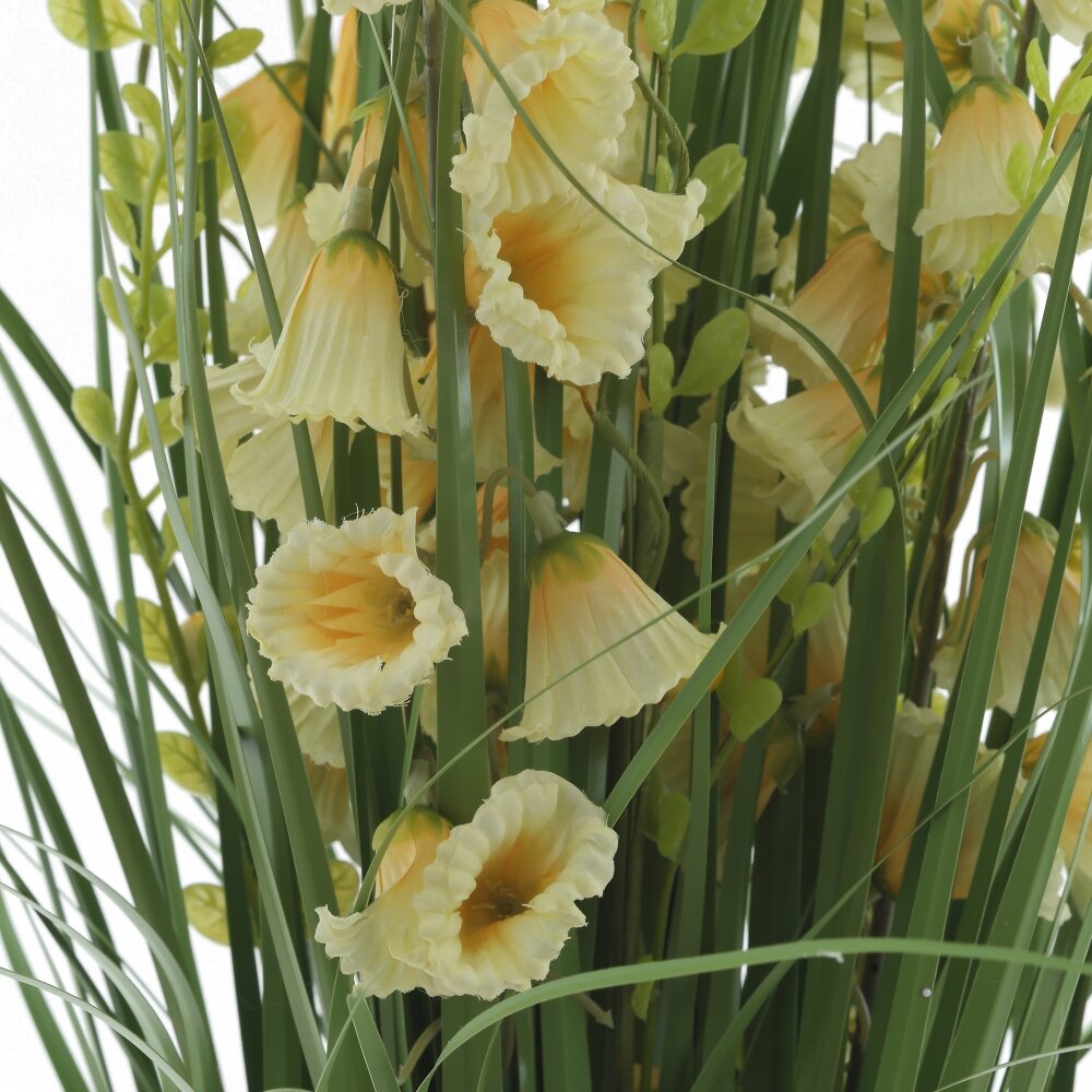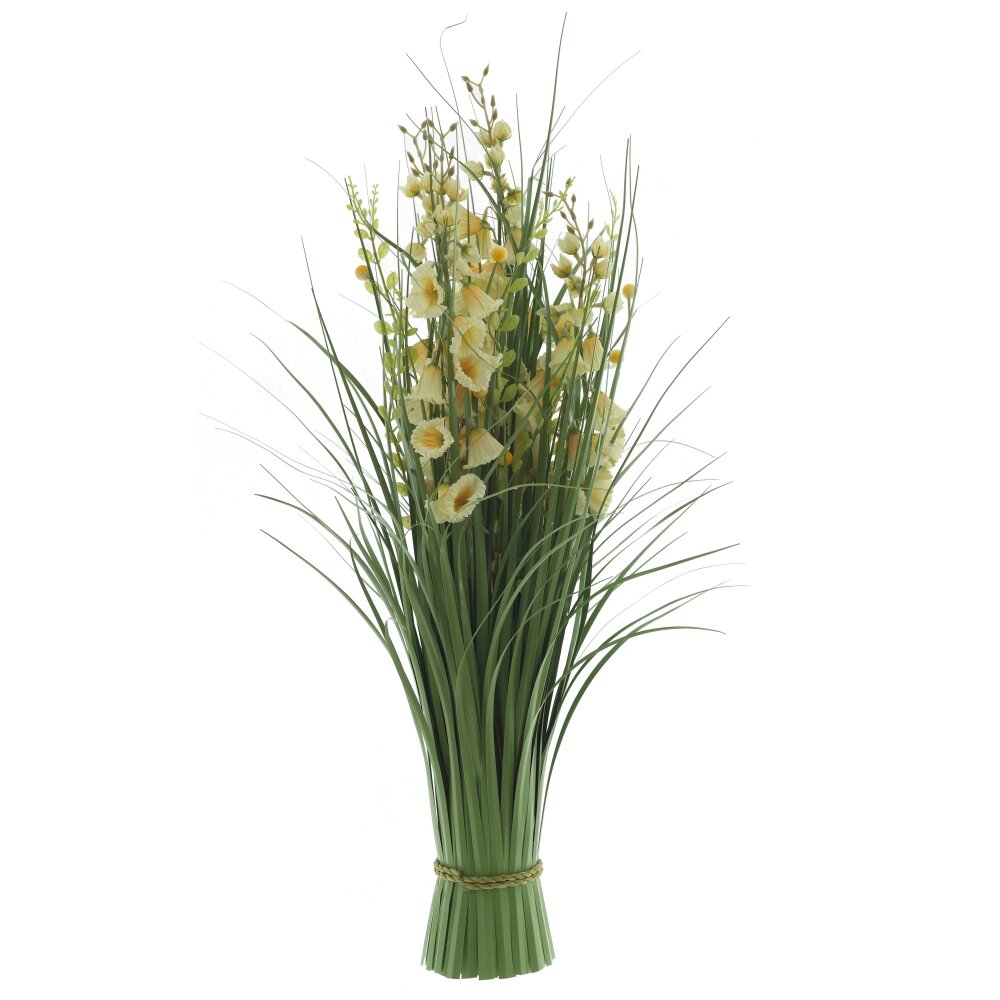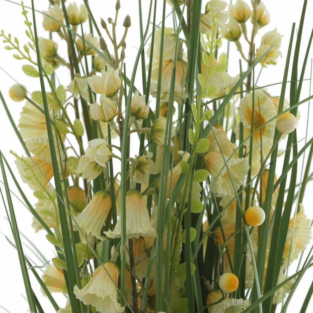 Искусственная цветочная композиция, напоминающая летний луговой букет. В центре — тонкие стебли с нежными кремово?жёлтыми цветками и округлыми бутончиками, окружённые пышными длинными травянистыми листьями разной высоты. Низ собран в аккуратный пучок и перевязан декоративным шнуром, благодаря чему композиция держит форму и смотрится естественно даже без вазы. Подходит для оформления гостиной, прихожей, офиса или витрины, гармонирует с эко?, сканди? и минималистичным стилями. Не требует ухода: достаточно периодически снимать пыль. Добавляет интерьеру свежести и мягкого оттенка солнечного света круглый год.