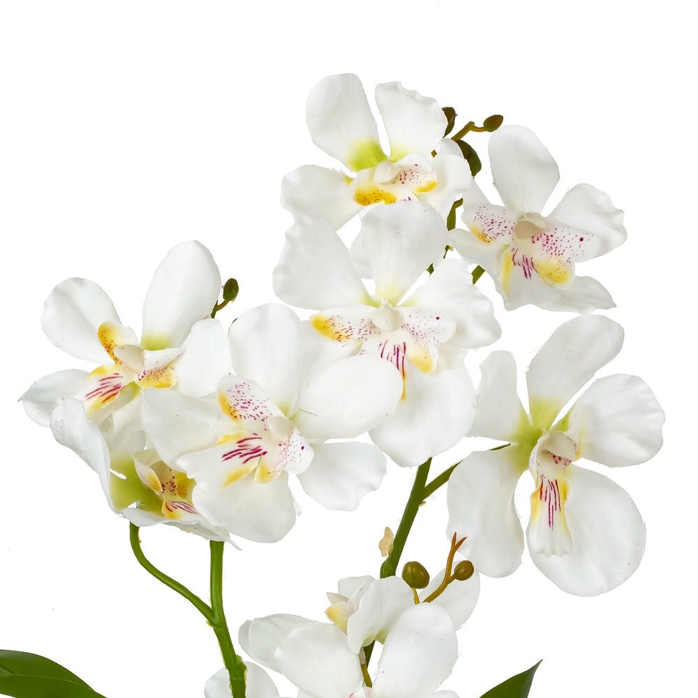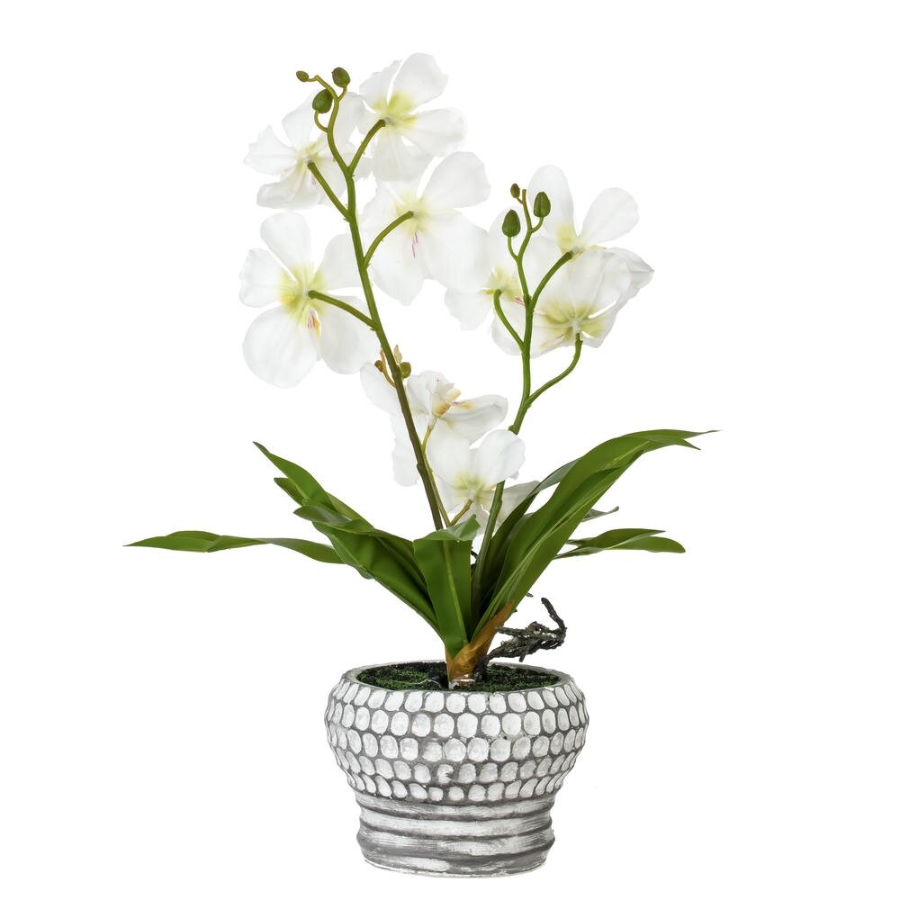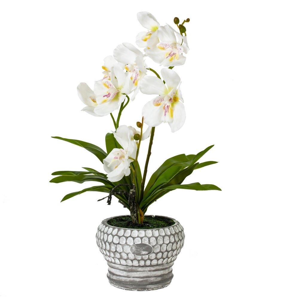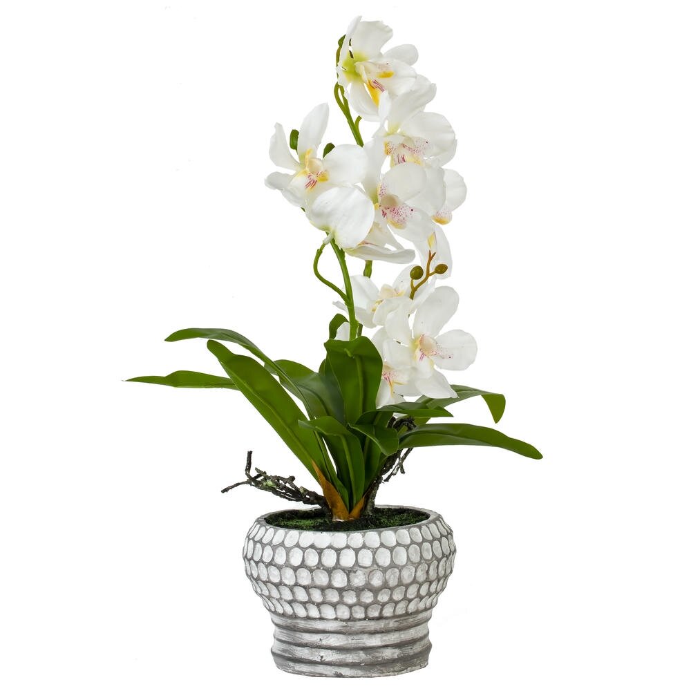 Цветочная композиция «Орхидея» — изящный интерьерный акцент, созданный из качественных полимерных материалов и установленный в устойчивое цементное кашпо. Белоснежные соцветия с лимонно-желтыми сердцевинами и тонкими розовыми штрихами выглядят реалистично, а глянцевые зеленые листья и аккуратные бутоны дополняют естественный образ. Фактурный серый горшок с рельефным узором подчеркивает утонченность растения и надежно фиксирует стебли. Композиция долговечна, не требует полива и особого ухода, легко очищается от пыли и сохраняет форму и цвет в течение многих лет. Подходит для дома, офиса, ресепшена или подарка, привнося в пространство свежесть и ощущение спокойствия.