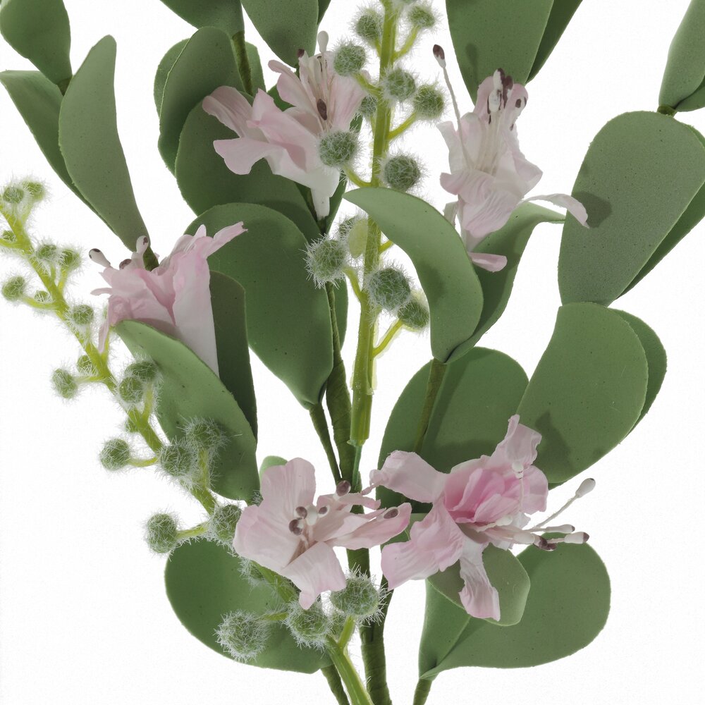 Искусственная ветка с цветами — изящный декоративный элемент для оформления интерьера и пасхального декора. Нежные розовые бутоны в сочетании с густой зеленью и фактурными соцветиями выглядят максимально натурально и создают ощущение свежести весеннего сада. Ветка отлично подойдёт для составления праздничных композиций, украшения пасхального стола, корзин, венков, а также для декора каминной полки или подоконника. Благодаря прочному стеблю её удобно вставлять в вазы и флористические оазисы, комбинировать с другими искусственными и живыми растениями. Изделие не требует полива и особого ухода, не выгорает при умеренном освещении и надолго сохраняет аккуратный вид. Материал: полимерные материалы, текстильные материалы, металл.