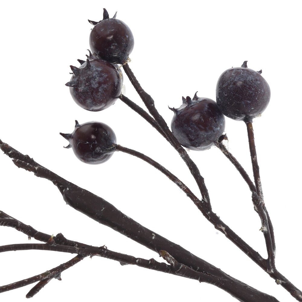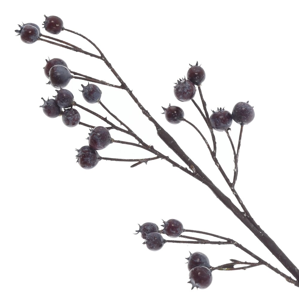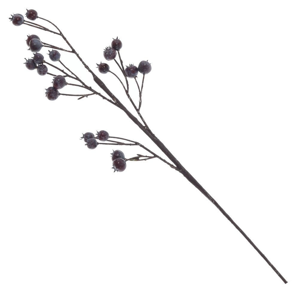 Искусственная ветка с ягодами для декоративных композиций. Тонкий коричневый стебель с разветвлениями украшен округлыми темно-бордовыми ягодами с легким эффектом инея, благодаря чему ветка выглядит максимально естественно и добавляет зимнее настроение. Каркас гибкий: удобно придавать форму, фиксировать в венках, букетах и новогодних арранжировках. Не требует ухода, не осыпается и долго сохраняет первоначальный вид. Подходит для оформления интерьера в эко, сканди и минималистичном стиле, для фотозон, подарочных коробок и декора витрин. Отлично смотрится в вазе как соло-акцент или в сочетании с хвойными и сухоцветами. Материалы: полимер/пластик, проволочная основа.