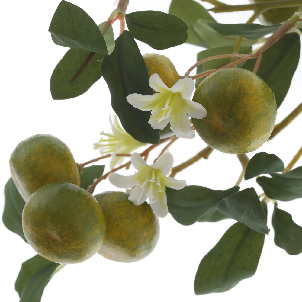 Искусственная ветка мандарина — изящный декоративный акцент для интерьера. На тонком коричневом стебле расположены плотные зеленовато?желтые плоды разного размера, окруженные насыщенно?зелеными листьями и мелкими светлыми цветками. Реалистичная фактура и естественные оттенки создают впечатление живого растения, при этом композиция не требует ухода: не вянет, не осыпается и сохраняет форму круглый год. Ветку удобно использовать в вазах, сезонных композициях, витринах, фотозонах или для оформления подарков. Гибкий стебель позволяет легко менять изгиб и направление. Идеальный вариант для кухни, гостиной или офисного пространства, чтобы добавить свежести и летнего настроения.