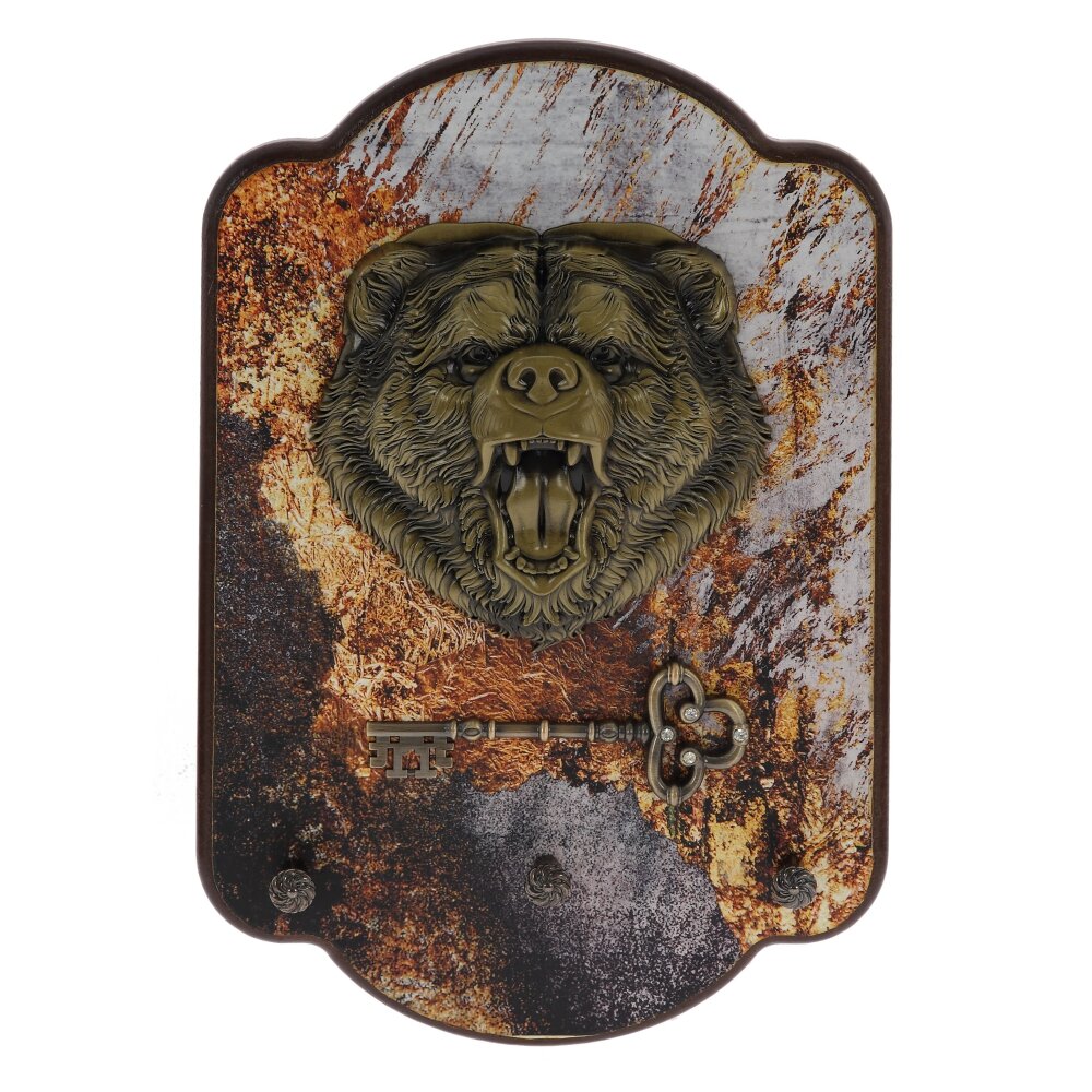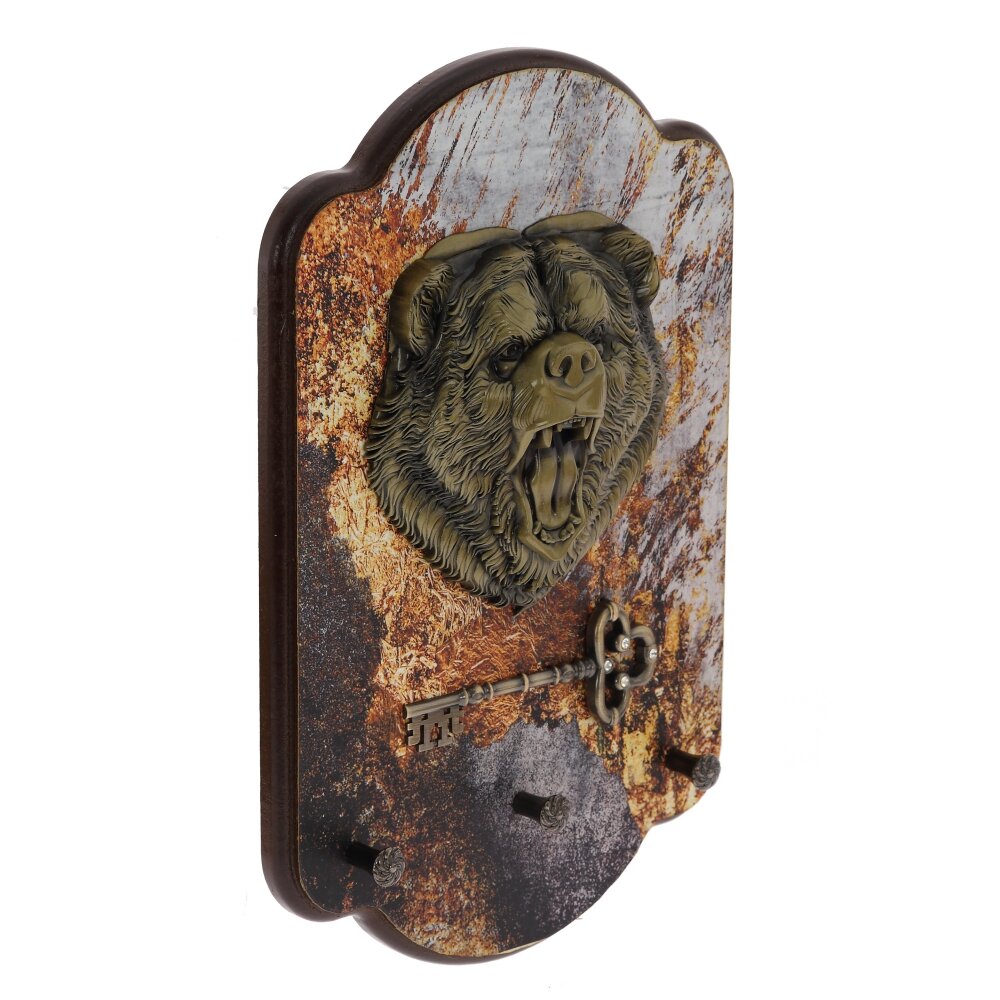 Ключница открытого типа с тремя крючками. Украшена декоративными металлическими элементами в виде головы медведя и ключа. Ключница – предмет не только красивый, но и функциональный, поэтому ей найдется место и в квартире, и в загородном доме.