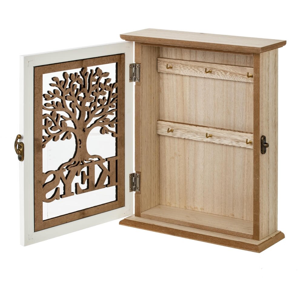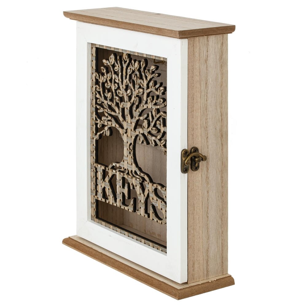 Настенная ключница из дерева с декоративной металлической фурнитурой — стильное и практичное решение для прихожей. Корпус выполнен из натурального дерева в светлых тонах, фасад украшен ажурной резьбой в виде дерева и надписью «KEYS», обрамлённой белой рамкой. На дверце установлена прочная металлическая защёлка под бронзу, которая надёжно фиксирует створку и придаёт изделию винтажный шарм. Внутри расположены 6 удобных металлических крючков для связок ключей от дома, гаража, офиса и других важных мелочей. Ключница помогает поддерживать порядок, экономит место и становится выразительным акцентом в интерьере в стиле прованс, кантри или сканди. Подходит для настенного крепления.