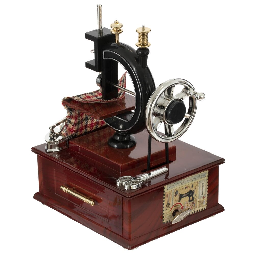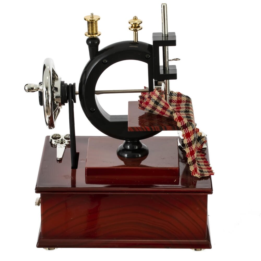 Декоративное изделие «Швейная машинка» – изящный винтажный акцент для дома и оригинальный подарок любителям рукоделия. Миниатюрная машинка выполнена в стиле старинного швейного аппарата: на лакированной подставке с выдвижным ящичком расположены аккуратные металлические детали, катушка, крошечный утюг и ножницы. Яркий лоскут ткани добавляет композиции реалистичности и уюта. Встроенный музыкальный механизм с заводным ключом воспроизводит приятную мелодию, создавая тёплую атмосферу и вызывая ностальгию по домашним вечерам. Подойдёт для интерьера гостиной, спальни, швейной мастерской, а также как эффектный сувенир или коллекционный экспонат.