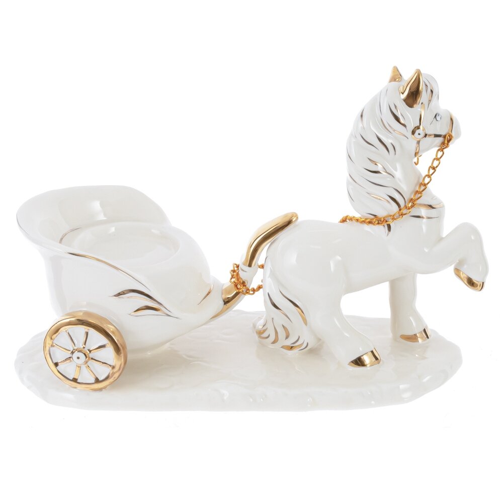 Элегантная декоративная фигурка в виде лошадки с подсвечником— это не только красивый элемент интерьера, но и практичный аксессуар. Изготовлена из высококачественного белого фарфора и украшена утонченными золотыми элементами, она придаёт пространству изысканность и уют. Такая фигурка станет прекрасным подарком, символизирующим удачу, движение вперёд и гармонию. Идеально впишется в классический и современный интерьер, украсит полку, туалетный столик или рабочее место. Благородное сочетание белого и золотого цветов делает изделие универсальным и по-настоящему праздничным.
