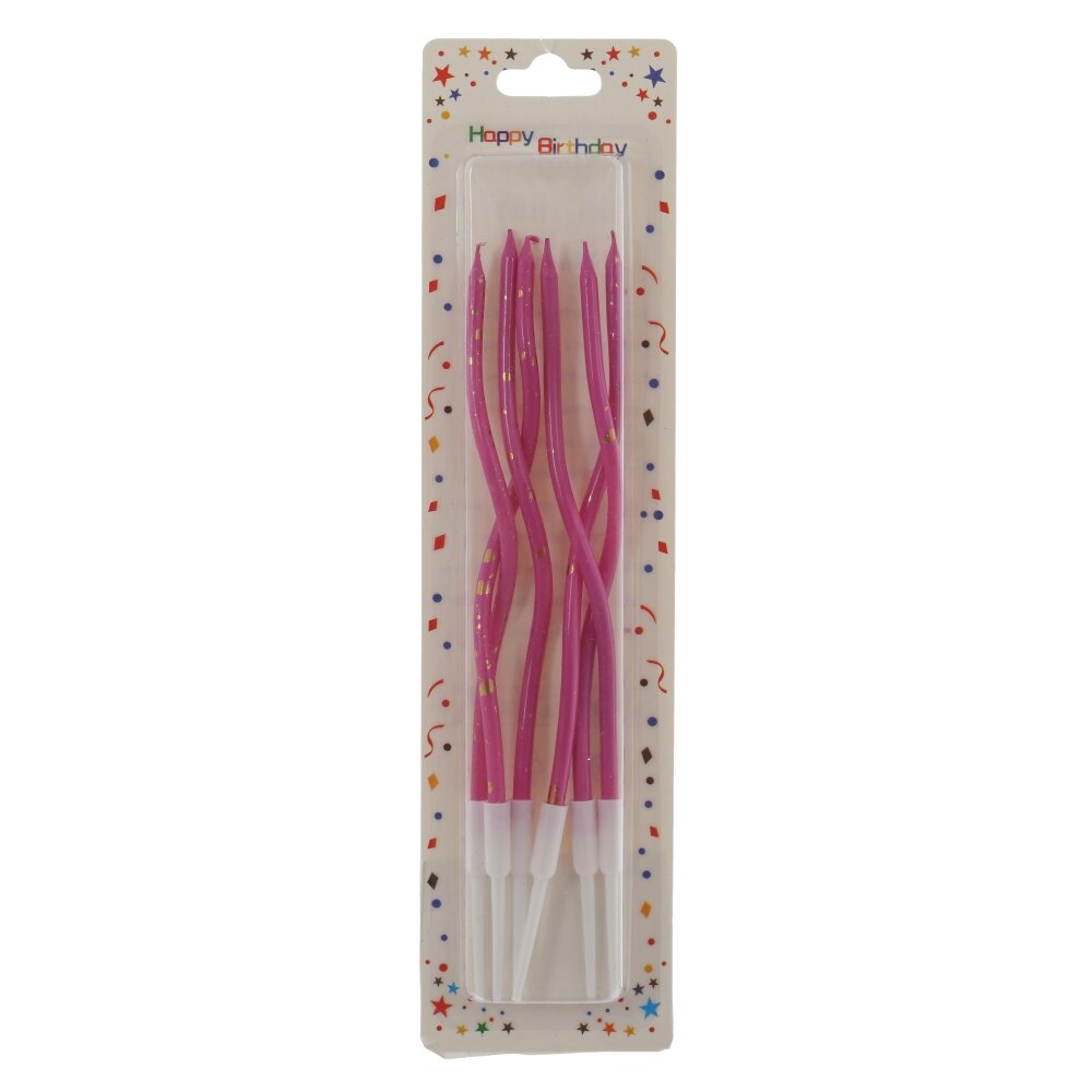 Набор из 6-ти праздничных свечей для торта из качественного парафина. Свечи длинные, изящно изогнутые волной, ярко?розового цвета с тонкими золотистыми акцентами — эффектно смотрятся на фото и видео. Каждая свеча закрепляется на белом пластиковом держателе, который легко входит в бисквит и крем и обеспечивает устойчивость. Ровное пламя и аккуратное горение создают атмосферу праздника. Подходят для детских и взрослых дней рождения, тортов и капкейков. Упаковка с надписью Happy Birthday — готовый вариант для подарка. Рекомендации: зажигайте непосредственно перед подачей, держите вдали от сквозняков, не оставляйте без присмотра и не допускайте контакта с декором, который может плавиться.