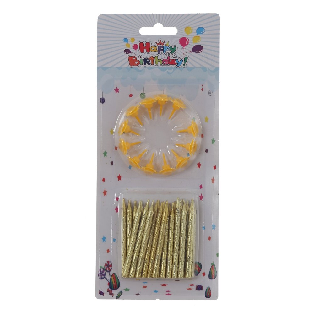 Праздничный набор из 24 парафиновых свечей для торта. Тонкие золотистые свечи со спиральной фактурой выглядят нарядно и заметно на праздничном столе. В комплект входят удобные пластиковые держатели жёлтого цвета: их легко вставить в бисквит или крем, не повреждая оформление десерта. Свечи подойдут для дня рождения и других торжеств, гармонично смотрятся на тортах любого стиля и размера. Упаковка с надписью Happy Birthday удобна для хранения и дарения. Рекомендации по использованию: устанавливайте свечи на охлаждённый торт, зажигайте перед подачей, не оставляйте без присмотра.