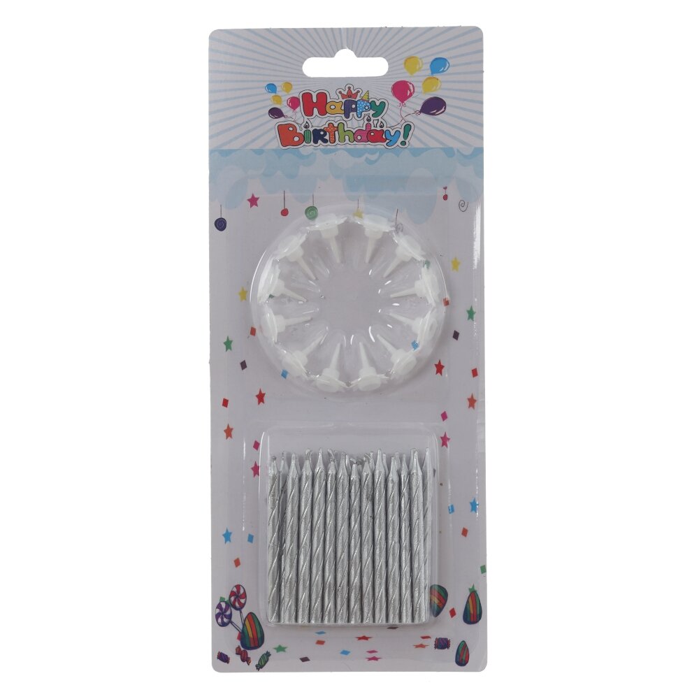 Праздничный набор из 24 парафиновых свечей для торта. Тонкие серебристые свечи со спиральной фактурой выглядят нарядно и заметно на праздничном столе. В комплект входят удобные пластиковые держатели жёлтого цвета: их легко вставить в бисквит или крем, не повреждая оформление десерта. Свечи подойдут для дня рождения и других торжеств, гармонично смотрятся на тортах любого стиля и размера. Упаковка с надписью Happy Birthday удобна для хранения и дарения. Рекомендации по использованию: устанавливайте свечи на охлаждённый торт, зажигайте перед подачей, не оставляйте без присмотра.