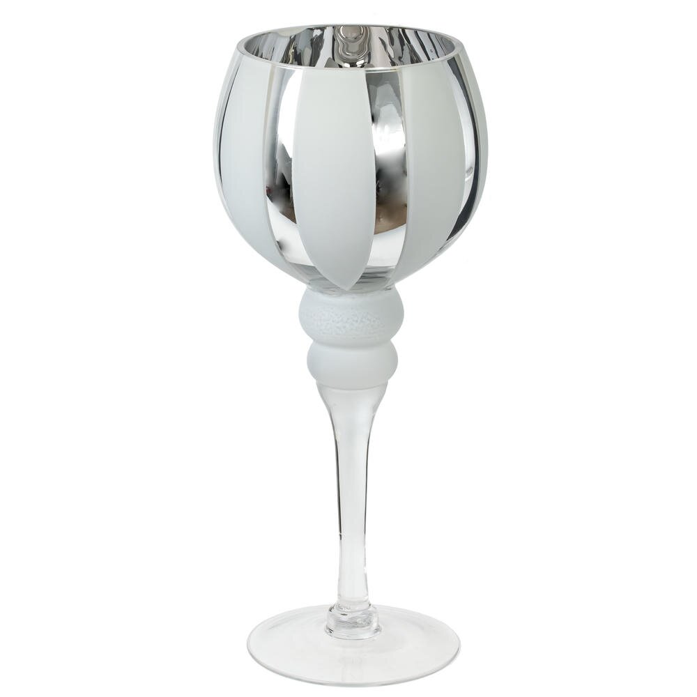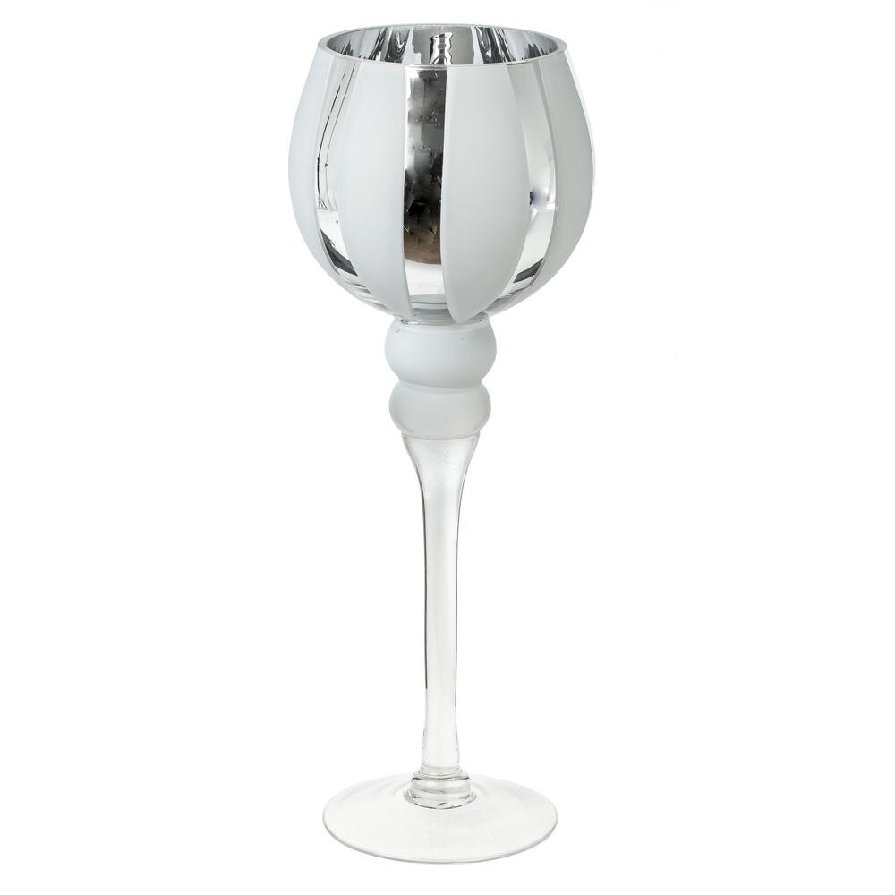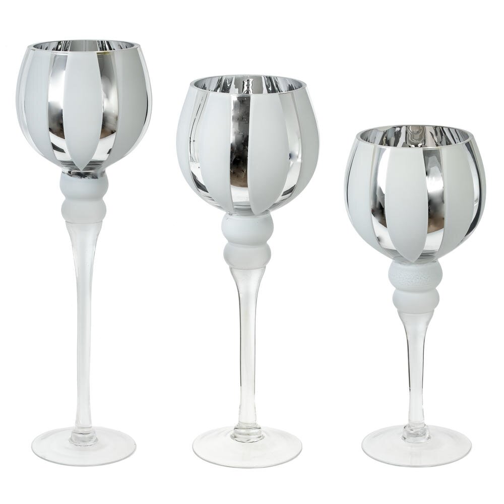 Набор из 3-х подсвечников. Материал — стекло. Элегантные изделия в форме высоких бокалов создают эффектную композицию благодаря разной высоте. Чаши украшены чередованием зеркальных и матовых белых вертикальных сегментов: отражающие полосы усиливают сияние пламени, а сатинированные — добавляют мягкости и глубины. Тонкие прозрачные ножки плавно переходят в устойчивые круглые основания, поэтому подсвечники надежно стоят на столе или каминной полке. Идеальны для интерьеров в современном, скандинавском или классическом стиле, для сервировки праздничного стола, свадьбы или уютного вечера. Подходят для стандартных свечей-таблеток или небольших свечей в стаканах. Уход простой: протирать мягкой сухой салфеткой, избегая абразивов и агрессивных средств. Размеры подсвечников: L12 W12 H30/35/40 см.