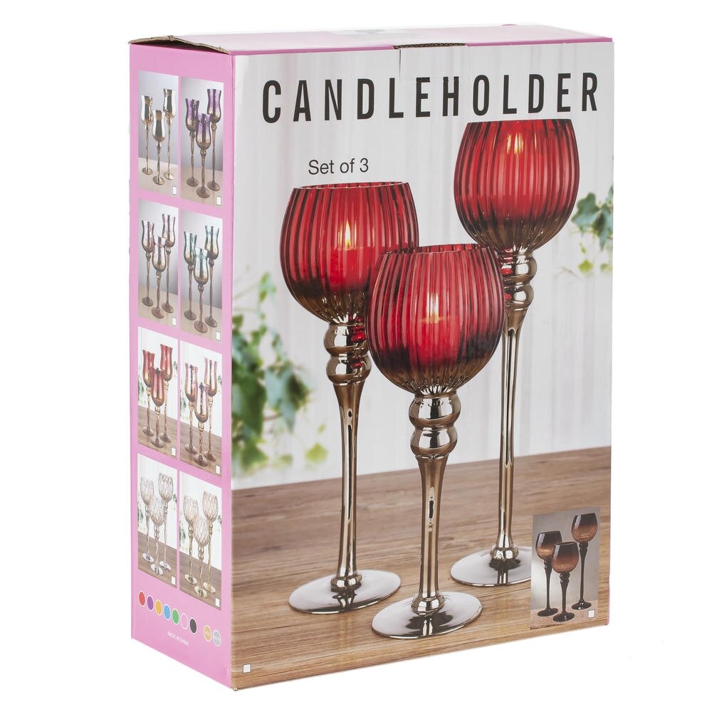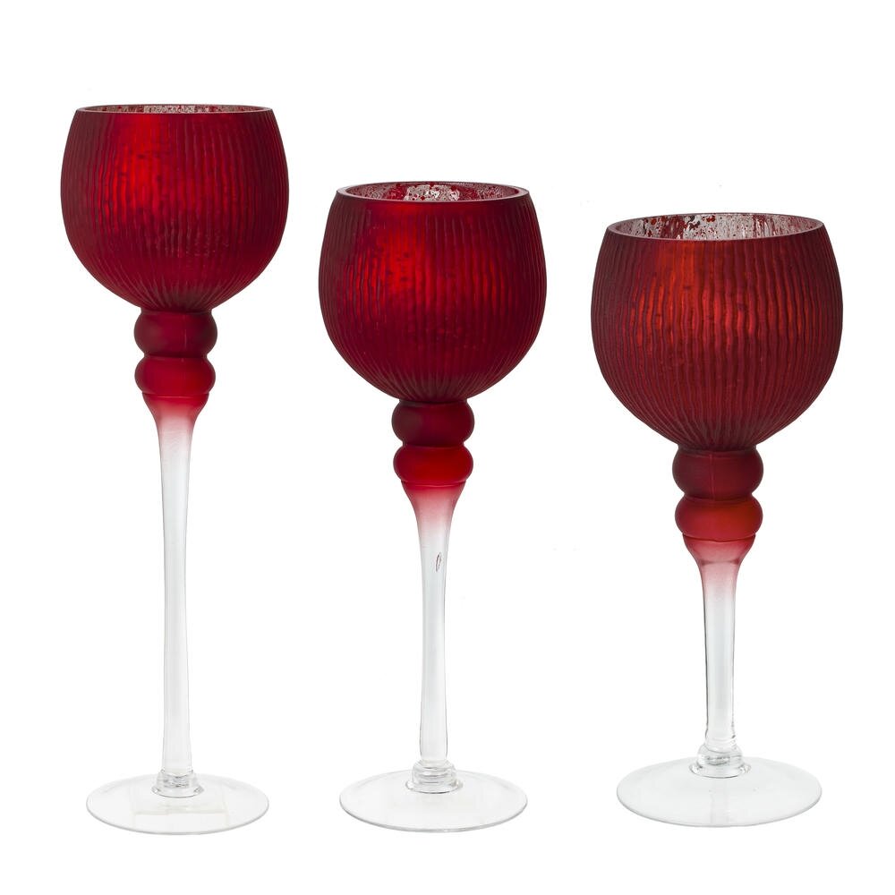 Набор из 3 стеклянных подсвечников в виде элегантных бокалов на высоких прозрачных ножках. Чаши глубокого бордово-красного цвета с матовым, рифлёным покрытием и лёгким градиентом к основанию. Разная высота элементов позволяет создавать выразительную композицию на столе, камине или подоконнике. Полупрозрачное стекло мягко рассеивает пламя, наполняя пространство тёплым рубиновым сиянием и создавая атмосферу уюта. Широкие круглые основания обеспечивают устойчивость. Подходят для чайных свечей или небольших свечей-таблеток. Идеальный акцент для праздничной сервировки, романтического вечера или современной гостиной. Легко сочетаются с сезонным декором и станут удачным подарком для ценителей стильных деталей интерьера. Размеры подсвечников: L12 W12 H30/35/40 см.