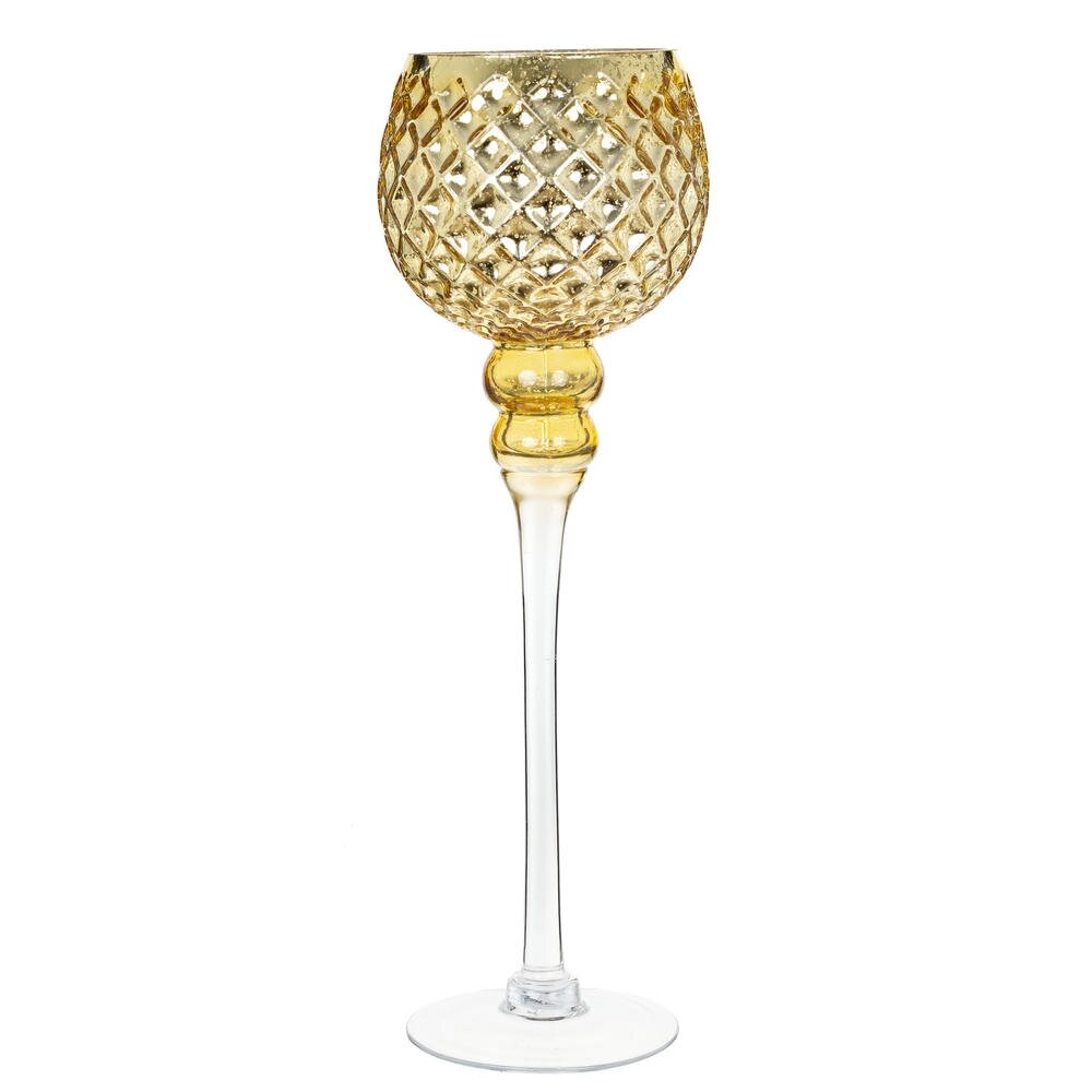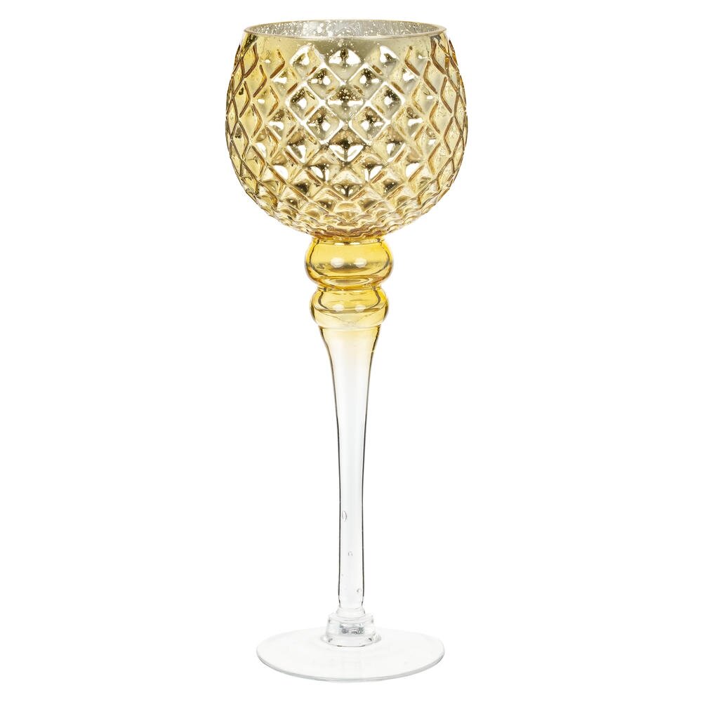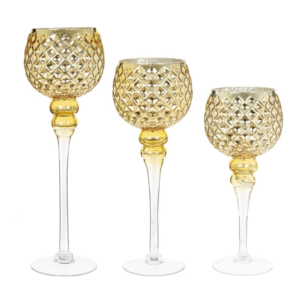 Элегантный набор из 3 стеклянных подсвечников. Чаши в форме бокала выполнены из фактурного стекла с ромбовидным узором и теплым золотисто?янтарным оттенком, ножки прозрачные, с широкими устойчивыми основаниями. Разная высота элементов создает выразительную многоуровневую композицию на камине, консоли или праздничном столе. Свет свечи красиво преломляется через грани и наполняет пространство мягким сиянием. Подходит для чайных свечей и небольших свечей?столбиков. Размеры: 13?13?30 см, 13?13?35 см, 13?13?40 см. Идеально для декора дома, торжеств и подарка.