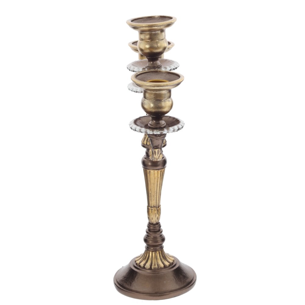 Элегантный трёхрожковый подсвечник в классическом стиле, выполненный из прочных полимерных материалов с эффектом бронзового и золотого литья. Изящные изогнутые держатели и рельефная ножка создают ощущение антикварного предмета, при этом изделие остаётся лёгким и устойчивым. Подходит для стандартных тонких свечей. Идеален для сервировки праздничного стола, оформления камина, гостиной или ресторана, добавляя интерьеру тёплый, благородный блеск и атмосферу уюта. Для свечей, диаметром 3,5 см