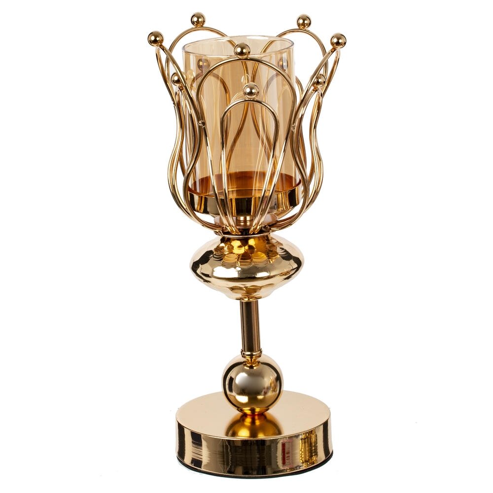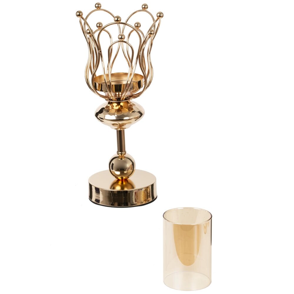 Элегантный подсвечник в современном стиле, выполненный из металла и стекла. Зеркальный золотистый металл образует изящный фигурный каркас в форме лепестков, внутри которого размещён цилиндрический стеклянный плафон. Такая конструкция надёжно защищает пламя свечи от сквозняков и подчёркивает мягкое мерцание света. Устойчивая круглая подставка и плавные декоративные линии делают подсвечник эффектным акцентом для гостиной, спальни или праздничного стола. Идеален для интерьерного декора, романтических вечеров и в качестве стильного подарка. Для свечи, диаметром 6,5 см.