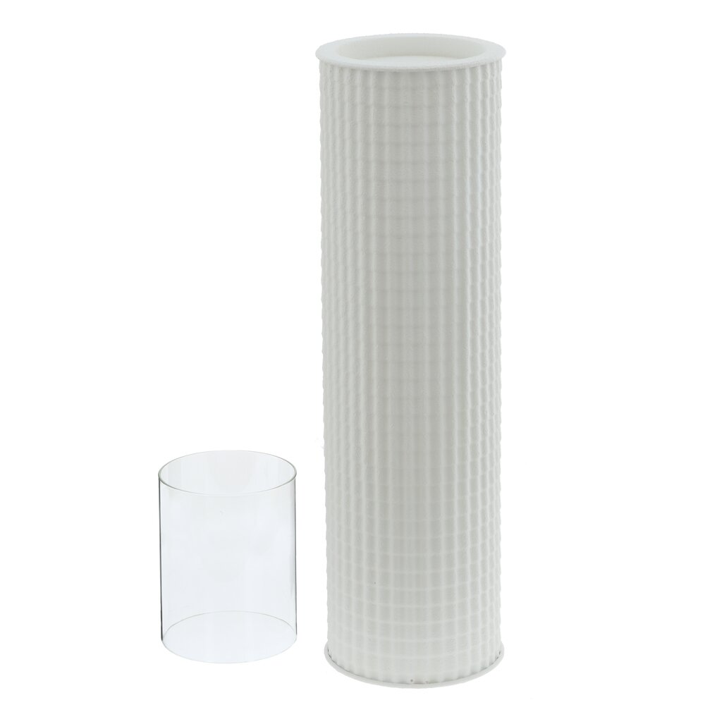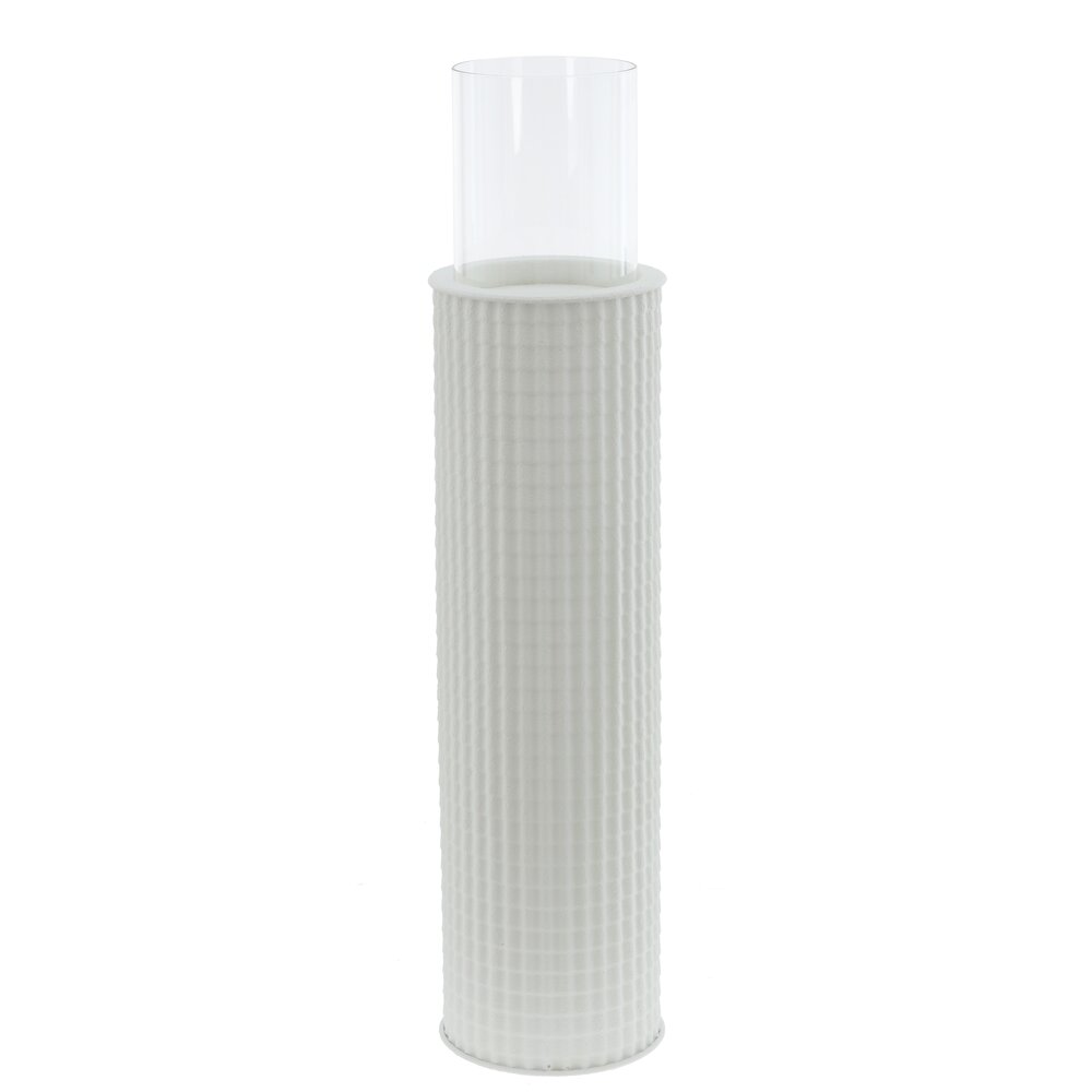 Стильный напольный подсвечник станет эффектным акцентом в современном интерьере. Массивная цилиндрическая основа из металла оформлена в лаконичном белом цвете и имеет фактурную рельефную поверхность, благодаря чему подсвечник выглядит благородно и легко сочетается как с минималистичным, так и с классическим декором. Прозрачный стеклянный цилиндр надёжно защищает пламя свечи от сквозняков и позволяет безопасно использовать изделие в жилых помещениях, на террасе или в зоне отдыха. Подсвечник рассчитан на установку массивных свечей?столбиков и идеально подойдёт для создания мягкого атмосферного освещения, романтической обстановки или праздничной сервировки. Надёжная конструкция и качественные материалы обеспечивают долговечность и простоту ухода. Диаметр основания для свечей 15 см.