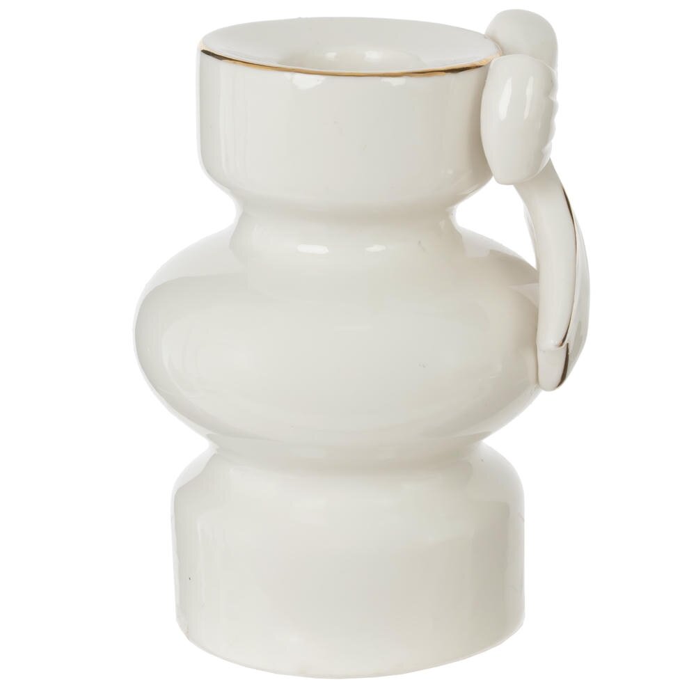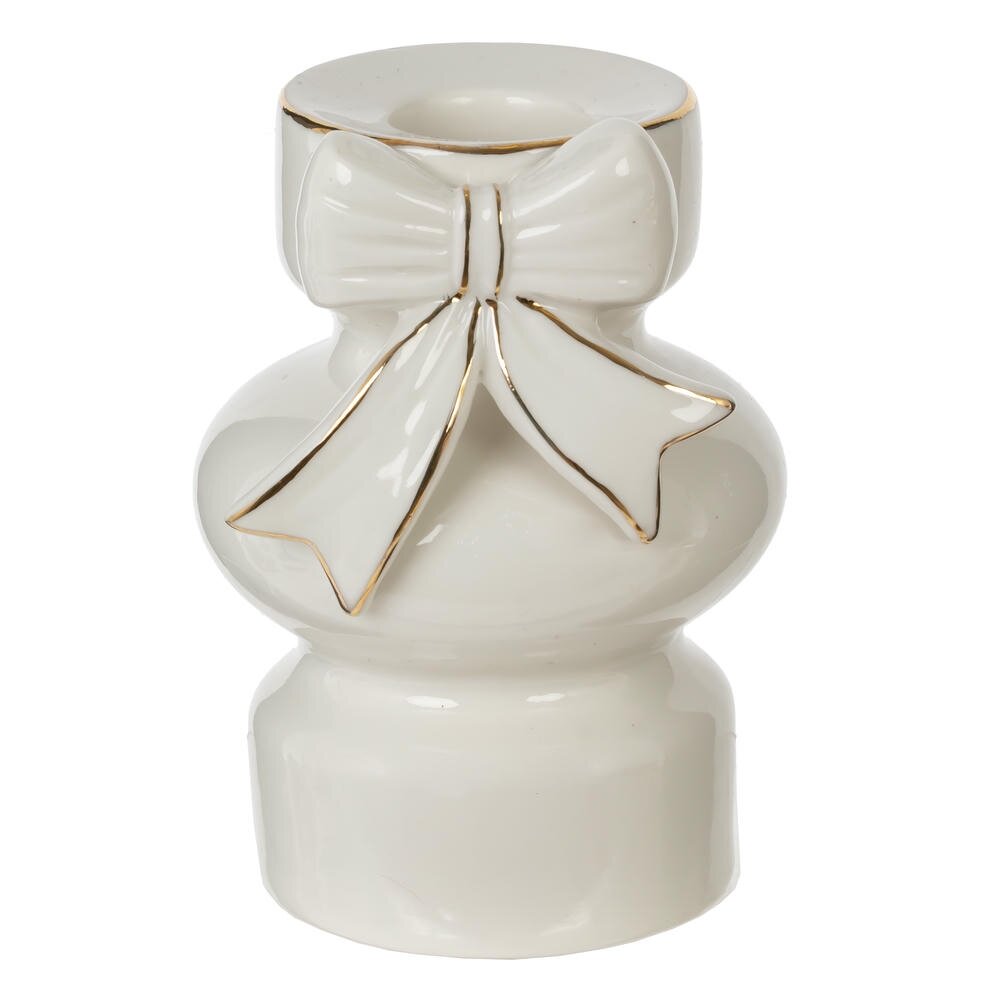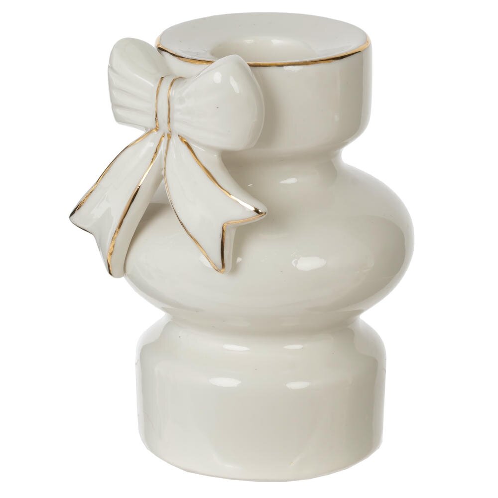 Изысканный подсвечник из белого фарфора — это элегантный элемент декора, который придаст вашему интерьеру утонченность и уют. Украшенный аккуратным бантом и декорированный изящными золотыми деталями, он смотрится особенно нарядно и празднично. Белый фарфор придаёт изделию легкость и чистоту, а золотой декор добавляет благородства и торжественности. Такой подсвечник идеально подойдёт для украшения праздничного стола, камина, полки или подоконника, создавая мягкое и уютное освещение. Он гармонично впишется как в классический, так и в современный интерьер, став акцентной деталью вашей новогодней или повседневной композиции. Подсвечник также может стать прекрасным подарком для ценителей утончённого стиля и изысканных аксессуаров. Его изящество и качество исполнения делают его не просто функциональным предметом, а настоящим произведением искусства.