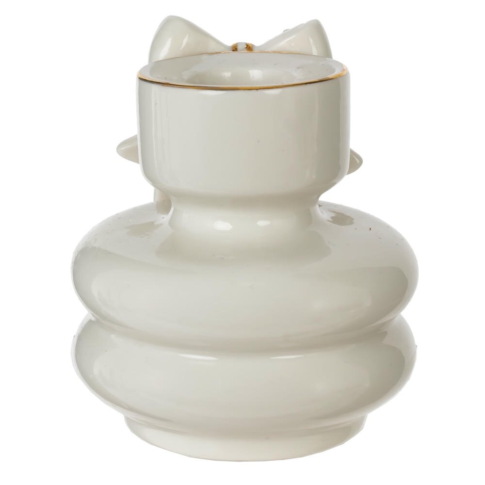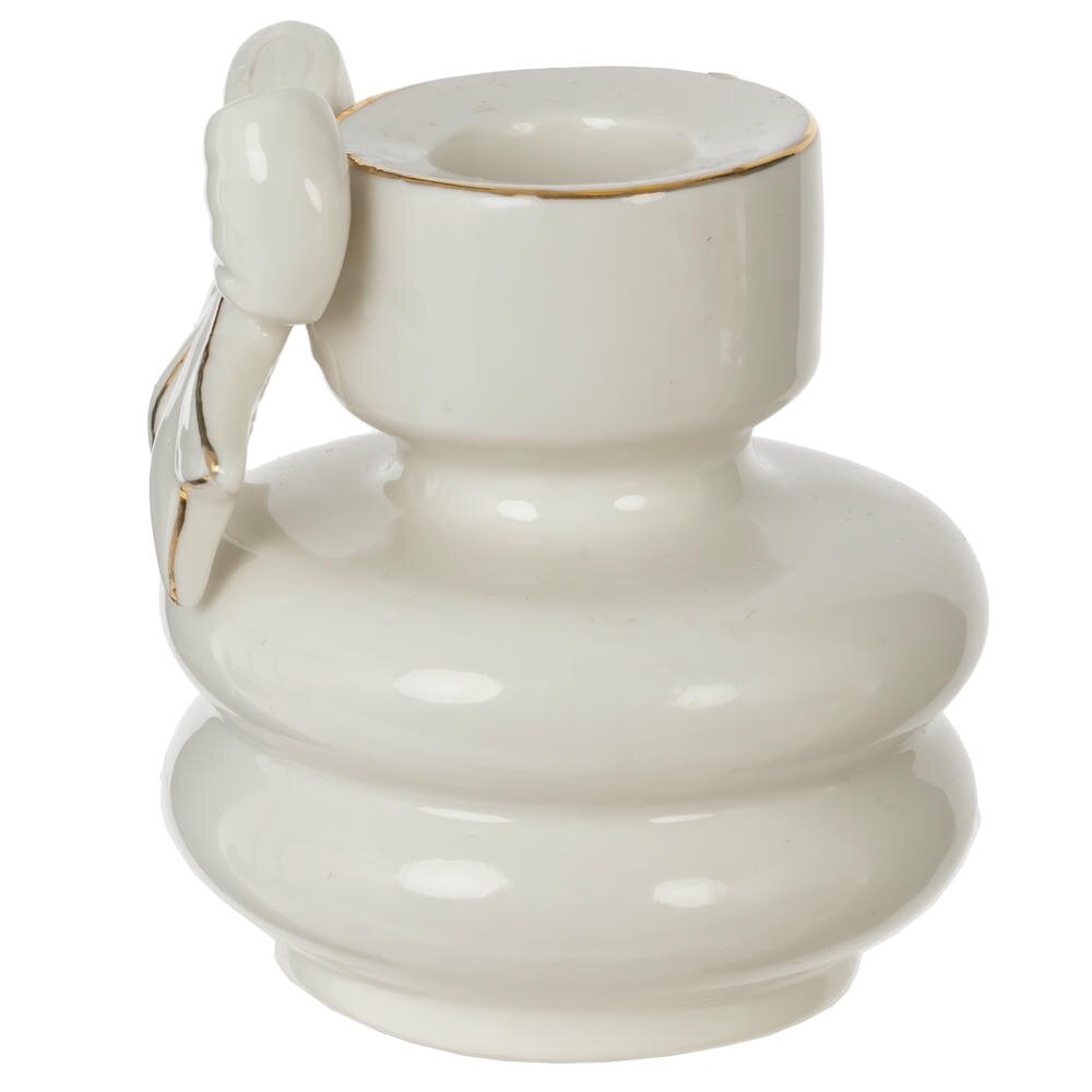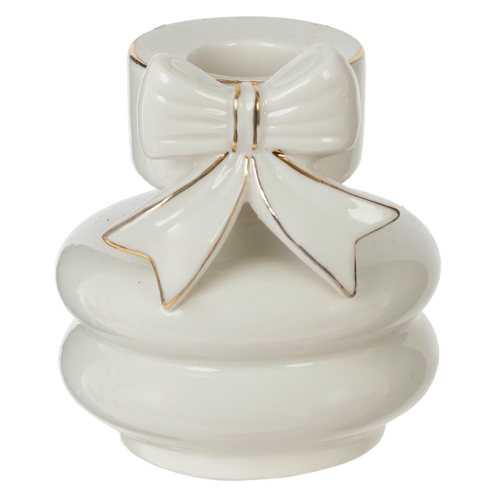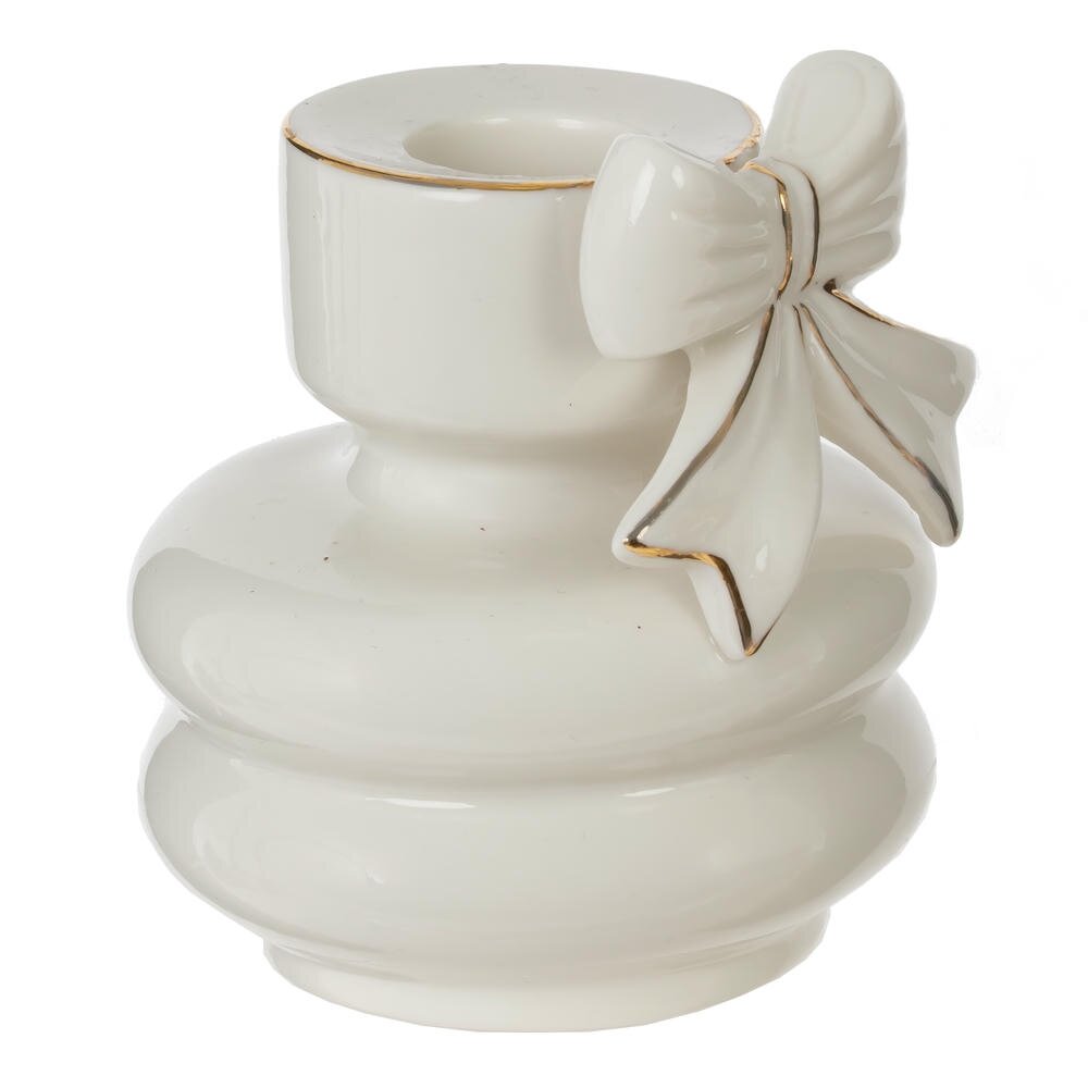 Изысканный подсвечник из белого фарфора — это элегантный элемент декора, который придаст вашему интерьеру утонченность и уют. Украшенный аккуратным бантом и декорированный изящными золотыми деталями, он смотрится особенно нарядно и празднично. Белый фарфор придаёт изделию легкость и чистоту, а золотой декор добавляет благородства и торжественности. Такой подсвечник идеально подойдёт для украшения праздничного стола, камина, полки или подоконника, создавая мягкое и уютное освещение. Он гармонично впишется как в классический, так и в современный интерьер, став акцентной деталью вашей новогодней или повседневной композиции. Подсвечник также может стать прекрасным подарком для ценителей утончённого стиля и изысканных аксессуаров. Его изящество и качество исполнения делают его не просто функциональным предметом, а настоящим произведением искусства.