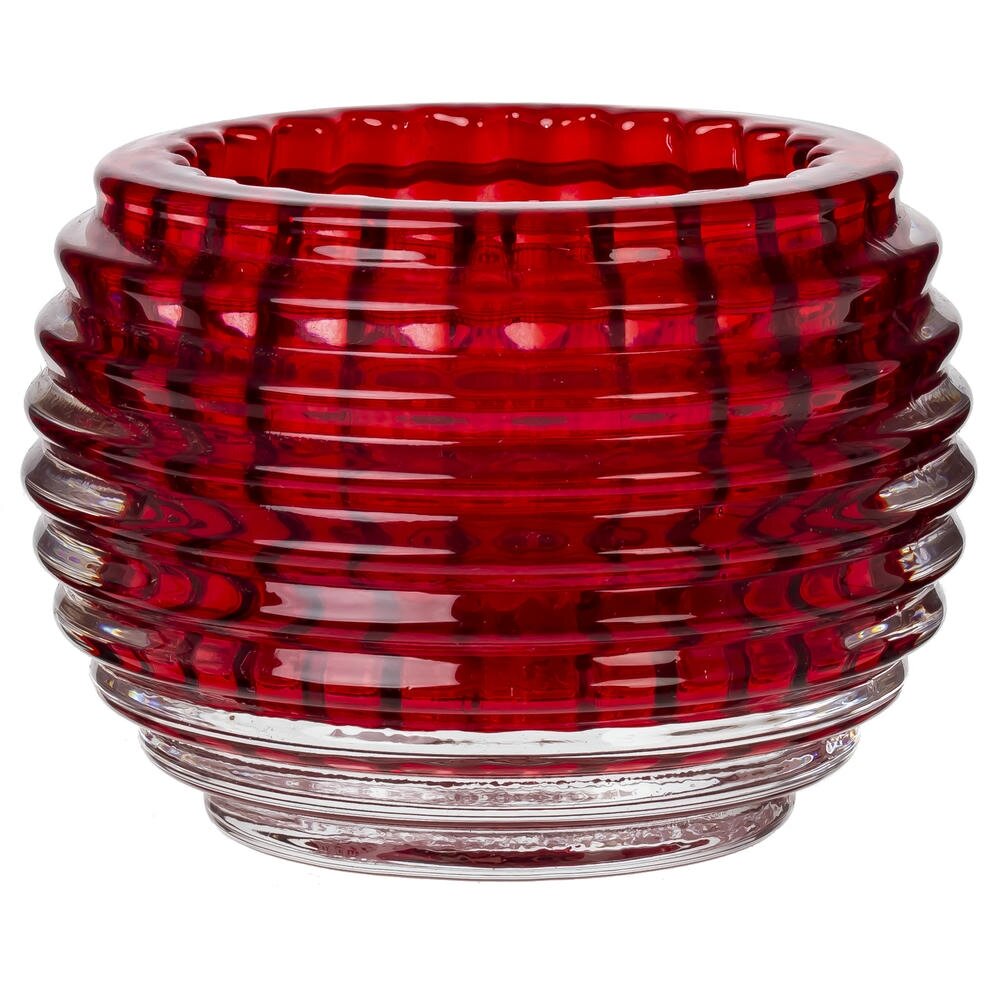 Стеклянный подсвечник округлой формы с выраженным рельефом: по всей поверхности идут плотные горизонтальные ребра, создающие эффект волнообразных колец. Стекло густо окрашено в рубиново?красный цвет, к основанию плавно переходит в прозрачное, благодаря чему при зажигании свечи свет преломляется и дает теплые блики и полосатые тени. Широкое горло удобно для чайной свечи или небольшой вотивной. Толстые стенки и тяжелое, устойчивое дно повышают безопасность и удерживают тепло. Глянцевая поверхность легко очищается. Подсвечник станет ярким акцентом на столе, полке или подоконнике, добавит уют в современный интерьер и уместен как праздничное оформление или романтический декор. Для свечи, диаметром 5 см.