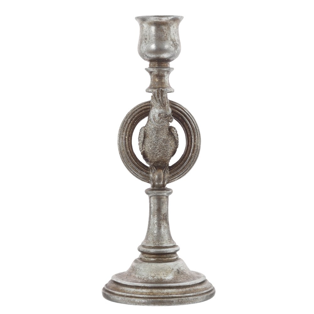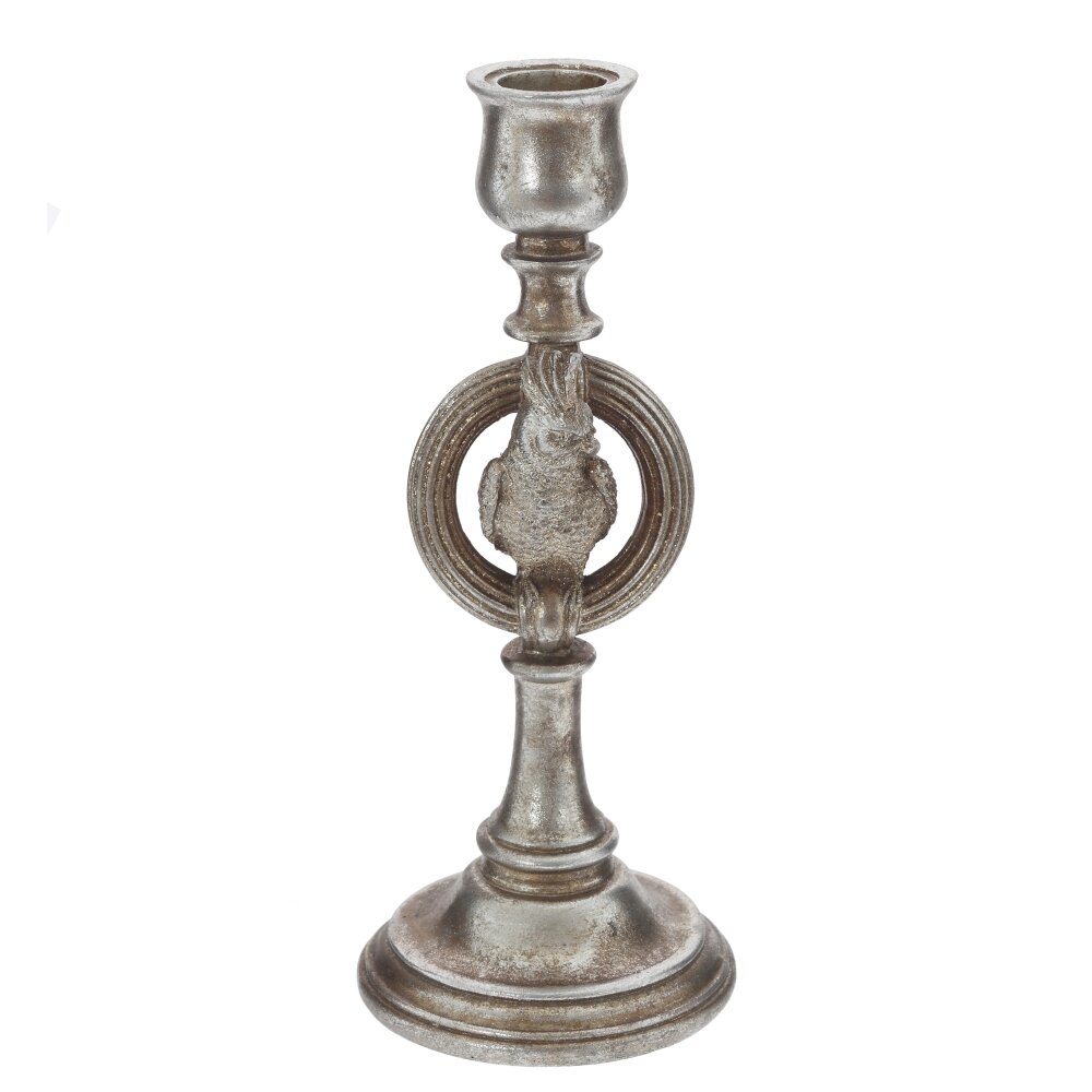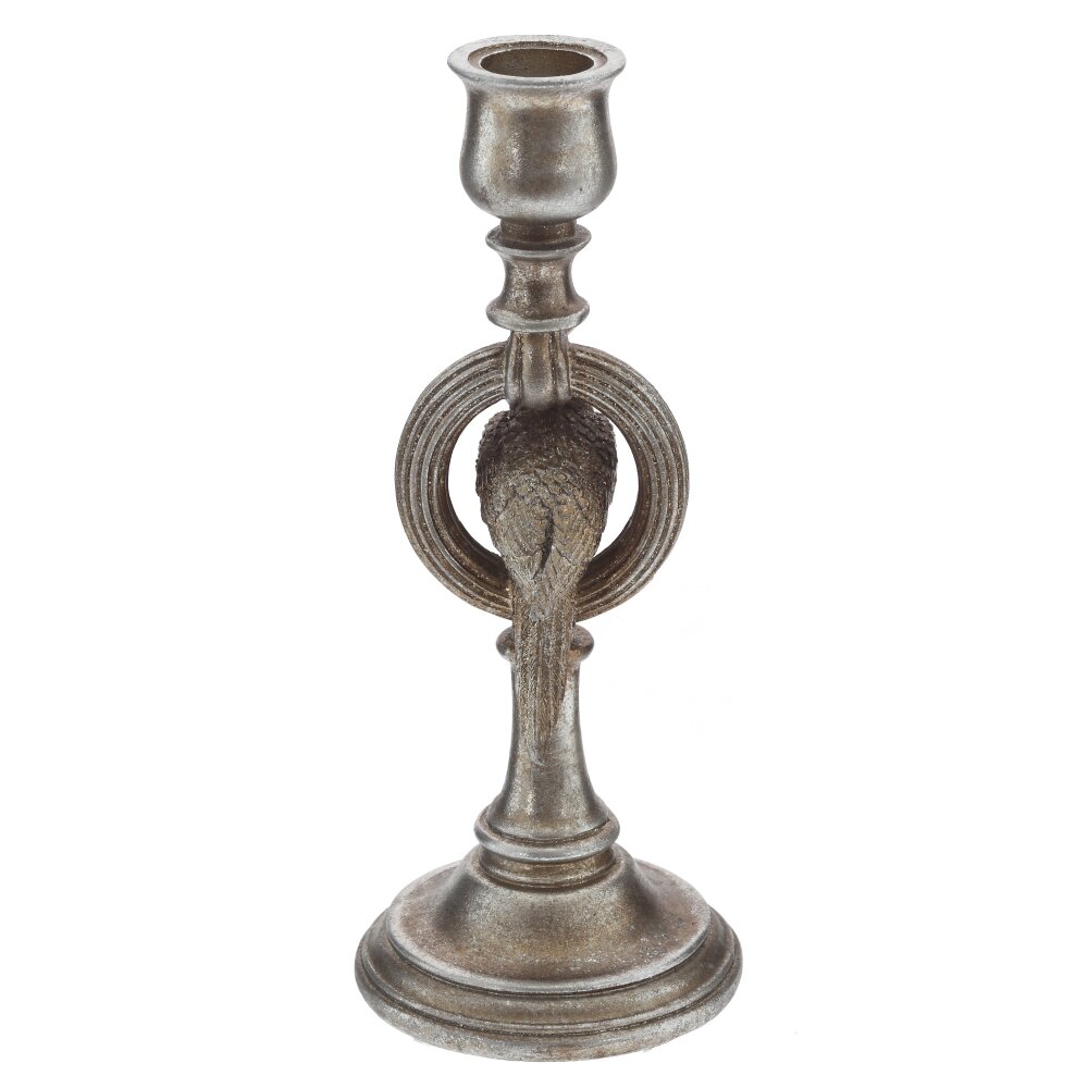 Элегантный декоративный подсвечник из полимерных материалов, выполненный под состаренное серебро. Изящная вытянутая ножка переходит в широкое устойчивое основание, а сбоку её украшает детальная фигура птицы, придающая изделию утончённый, чуть винтажный характер. Подсвечник рассчитан на одну стандартную тонкую свечу и станет выразительным акцентом в гостиной, спальне или на праздничном столе. Лёгкий, но устойчивый материал прост в уходе и не боится мелких бытовых повреждений, поэтому аксессуар долго сохранит безупречный внешний вид. Идеален в качестве подарка ценителям стильного интерьера и необычного декора. Для свечи диаметром 2,5 см.