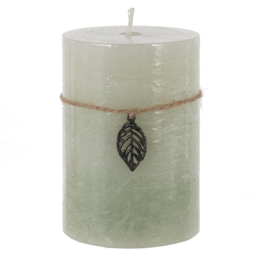 Элегантная цилиндрическая свеча диаметром 6,5 см в мягком светло?салатовом оттенке. Вокруг корпуса завязан тонкий джутовый шнур с подвеской?листом из темного металла — аккуратный акцент в стиле эко и рустик. Такая свеча гармонично впишется в гостиную, спальню или ванную, подойдет для сервировки стола, фотосессий и уютных вечеров. Ее нейтральный цвет легко сочетается с деревом, керамикой и стеклом. Используйте на жаропрочной подставке и не оставляйте без присмотра. Отличный вариант для подарка и домашнего декора.