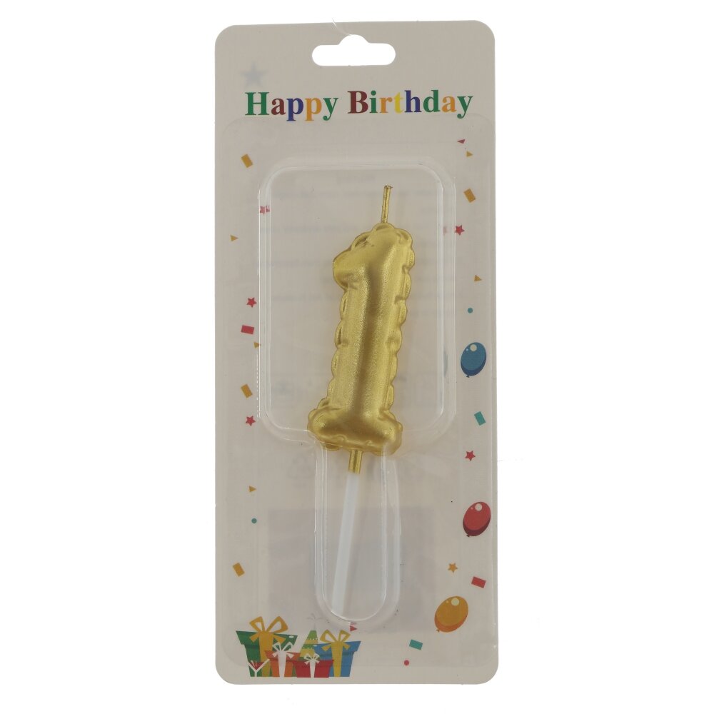 Праздничная свеча для торта «Цифра 1» из парафина в эффектном золотом цвете. Рельефная форма напоминает воздушный шар и привлекает внимание на фотографиях. Свеча закреплена на удобной прозрачной ножке, которая помогает аккуратно вставить её в бисквит или крем, а фитиль расположен сверху для лёгкого поджигания. Идеальна для дней рождения и юбилеев, легко комбинируется с другими цифрами для составления нужного возраста. Поставляется в блистерной упаковке с надписью Happy Birthday и праздничным декором — готовый вариант для оформления торта.